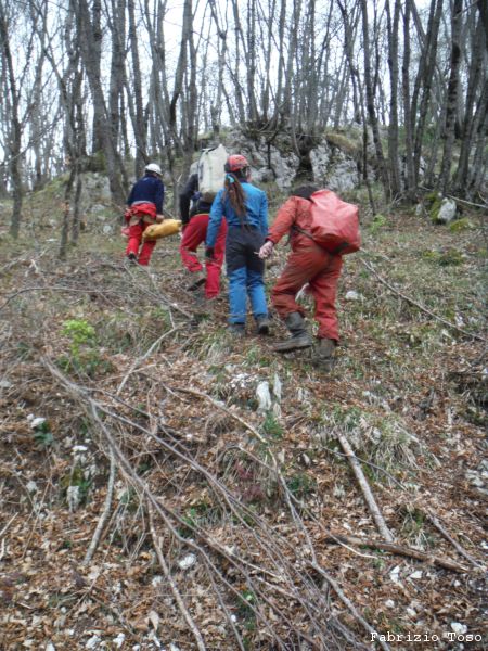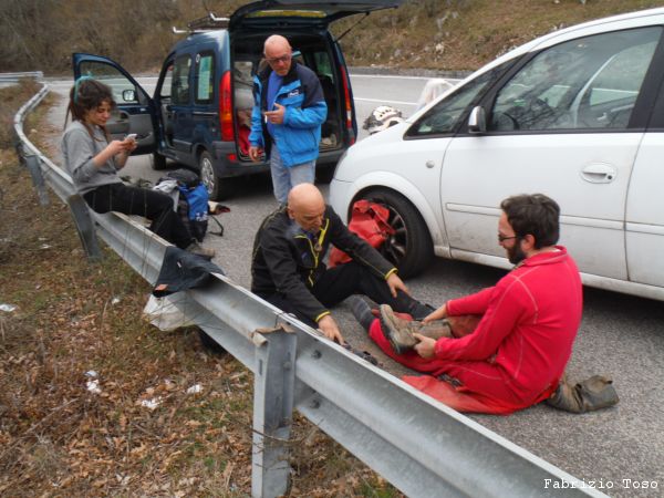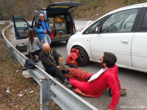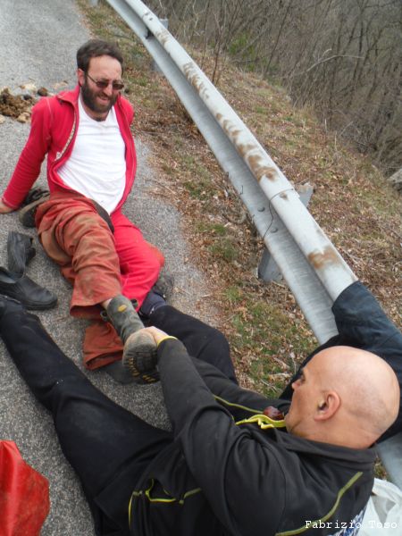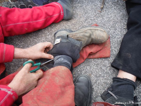 Lavoriamo di buona lena all’allargamento per 2 o 3 ore poi rimandiamo avanti Livia a provare. Il suo responso e’ desolante. La spaccatura continua stretta fino a dove riesce a vedere e non mostra voglia alcuna di allargare in maniera autonoma. Abbiamo tutti le braccia doloranti, Tarcisio piu’ di tutti perche’ la mazzetta, come ci dice lui, aveva poca mira e gli ha preso in pieno una mano, mazzetta dispettosa! Decidiamo che e’ l’ora di uscire. Sistemiamo il materiale negli zaini e risaliamo. Nerone pena un poco per risalire il pozzetto iniziale ma alla fine ne esce vittorioso. Scendiamo alle macchine dove troviamo Gianluca di ritorno dalla sua visita a Campo Catino. Visto che e’ presto Gianluca decide di tornare a casa, ci salutiamo dandoci appuntamento per la ripresa delle esplorazioni a Campovano. Iniziamo a cambiarci, per fortuna non fa freddo, sono fradicio di sudore. Mi sono coperto troppo. Nel cambiarsi Gabriele incappa in un problema, non riesce a togliere lo stivale destro. Nerone, che puo’ dire la sua in tema di assistenza a malconci di ogni tipo, si adopera nell’aiutarlo, io mi limito a documentare.