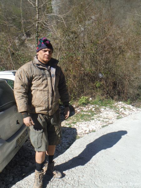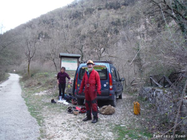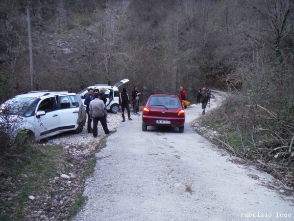 Espletato il bisogno primario di cibo ci dirigiamo verso la nostra meta, la voragine di MonteSpaccato. Sono anni che ne sento parlare ed oggi sono contento perche’ mi togliero’ finalmente la curiosita’. Strada facendo inizio a dubitare di riuscirci. Siamo una bella fila di macchine con quella di Domenico in testa. Prima imbocchiamo la strada per Carsoli…e torniamo indietro. Un giretto per Tivoli ed imbocchiamo un’altra strada…ma nemmeno questa e’ giusta. Altro giretto per Tivoli poi imbocchiamo la strada per San Polo. Mi ricordavo vagamente l’associazione Voragine-SanPolo ma, conoscendomi, non osavo manifestare questo inconsueto sprazzo di memoria. Comunque alla fine quest ultima si rivela quella giusta. Sali, sali e sali ancora arriviamo quasi in cima dove parcheggiamo in un ampio spiazzo.