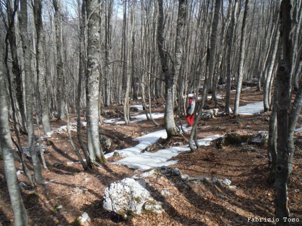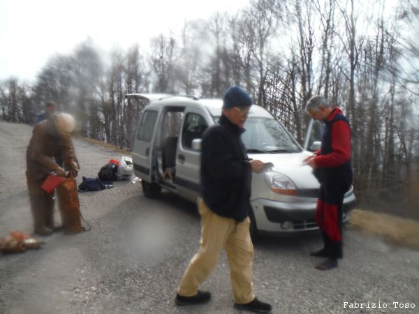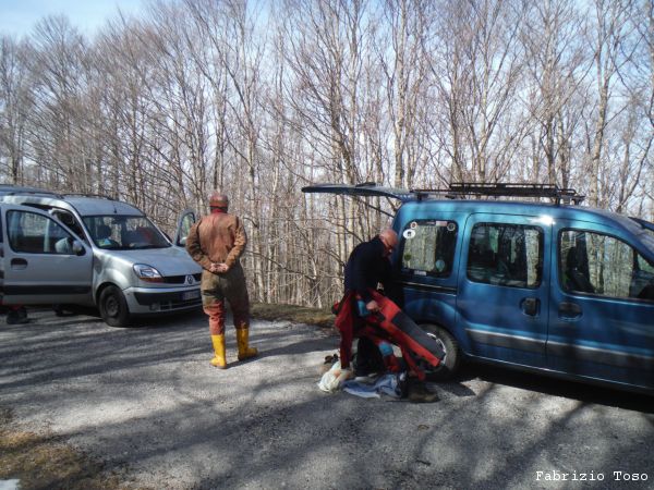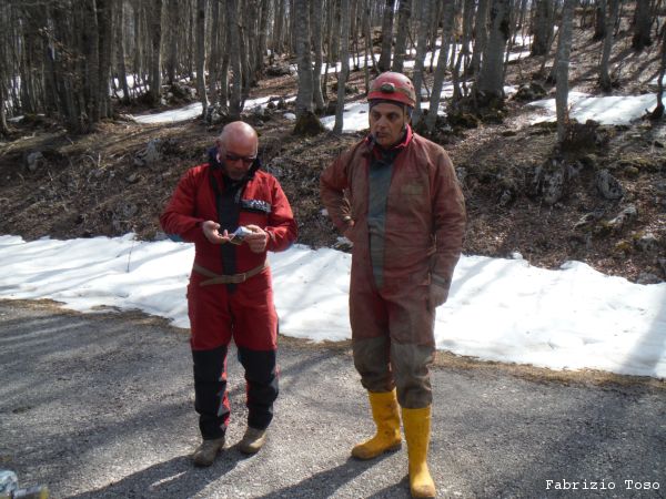 Stavolta sono solo a partire da Roma, quindi poco prima delle 8 prendo la macchina e vado. Alle 9.15 sono al solito bar. Parcheggio insieme a Fabrizio, arriviamo nello stesso momento. Dopo i saluti aspettiamo che ci raggiungano anche Tarcisio, Nerone e Gianluca e ce ne andiamo a fare colazione. Sentiamo Mirko per telefono, arriveranno in ritardo. Fabrizio ed io impieghiamo il tempo scendendo fino da Erzinio a prendere della pizza. Quando torniamo c’e’ ancora da attendere e ci uniamo agli altri che stanno seduti davanti al bar chiacchierando e prendendo il sole. Finalmente arriva anche Mirko col resto del gruppo. Altra salva di saluti con i nuovi arrivati, una puntata all’alimentari per le loro vettovaglie e poi finalmente possiamo partire. Prendiamo commiato da Gianluca che occupera’ la giornata con alcune grotte di recente scoperta in zona Campovano. Stavolta la neve non dovrebbe essere di intralcio, non piu’, saliremo quindi fino a Campo Catino per prendere la strada alta ed arrivare con le macchine molto vicino alla grotta. Come ci aspettavamo, la neve e’ quasi solo un ricordo. Dappertutto, tranne che in 2 punti della strada dove rischiamo di dover fare dietrofront. Sono salito in macchina con Fabrizio abbandonando la mia al parcheggio di Guarcino. E’ stata una ottima idea visto lo stato della strada. Fabrizio e’ indeciso sul punto dove fermarsi pero’ poi riconosce il posto ed accosta. L’arrivo degli altri ci conferma la giustezza della scelta. Iniziamo a prepararci.