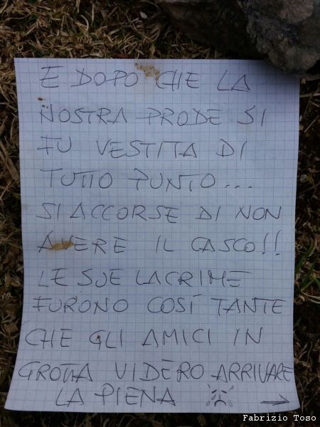 Sulla macchina troviamo le tracce di una visita. E’ passata Anna con l’intenzione di seguirci in grotta ma ha avuto un problema (lascio scoprire a voi quale leggendo il suo simpatico biglietto) e ha dovuto abbandonare.
