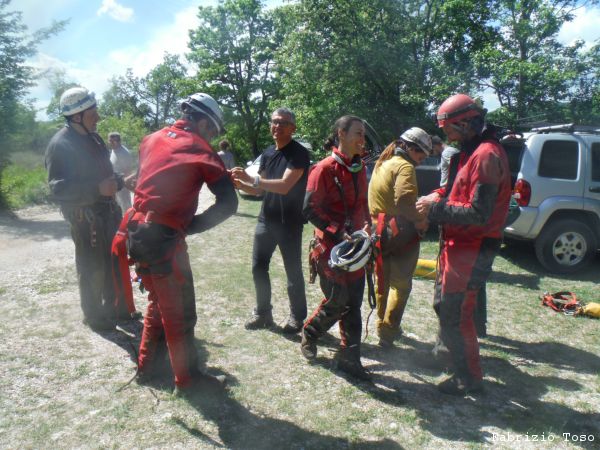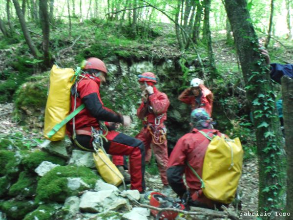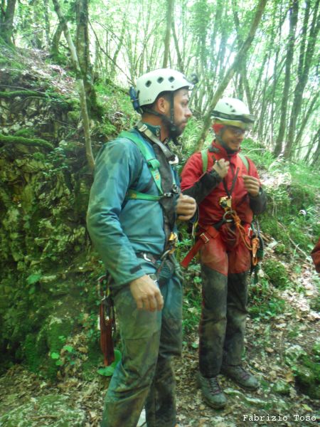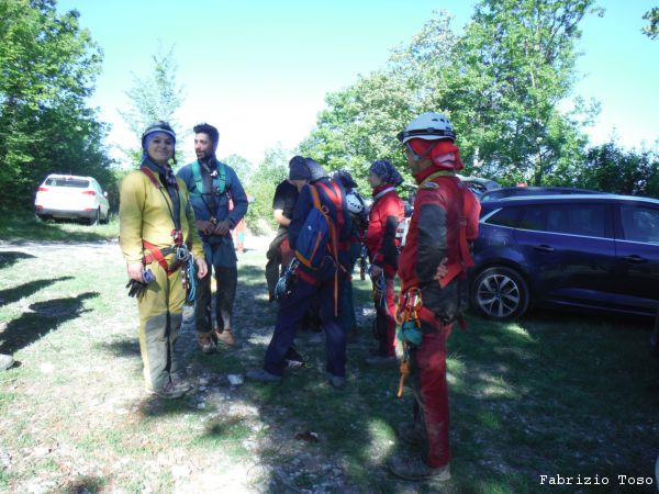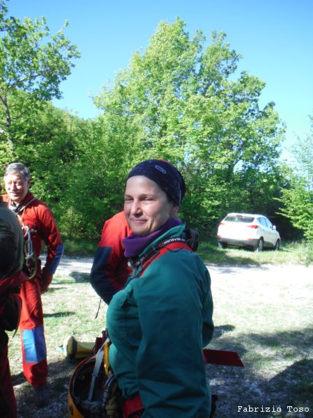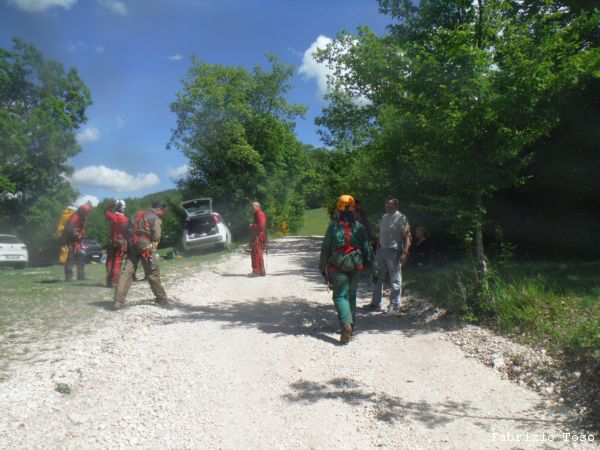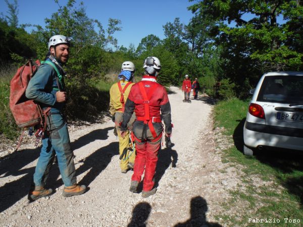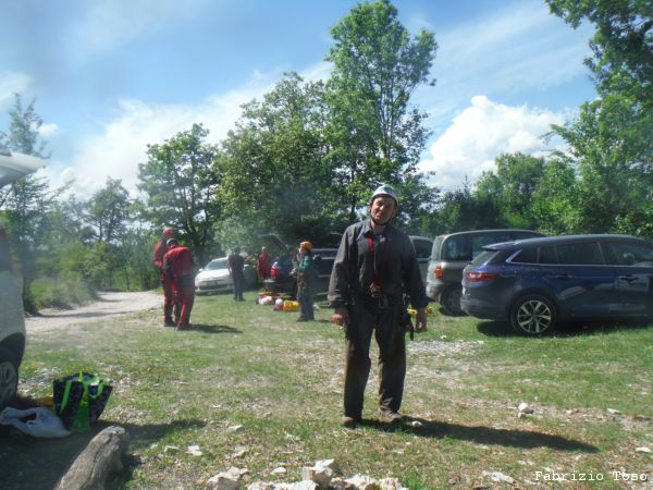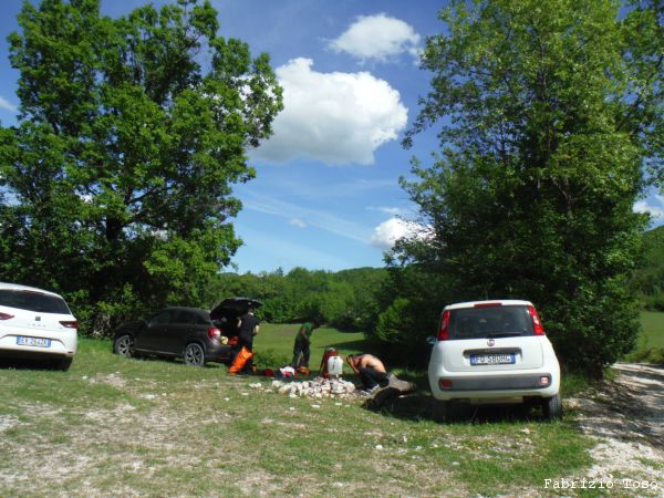 Dopo una rapida seconda colazione si riparte con destinazione grotta. Dobbiamo inerpicarci parecchio ma alla fine arriviamo allo spiazzo dove si parcheggia. Troviamo gia’ altre macchine, sono di speleologi che sono entrati stamane sul presto per andare al fondo del Chiocchio. Ci prepariamo svelti.