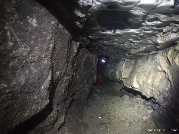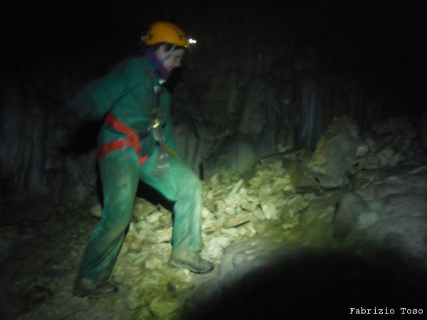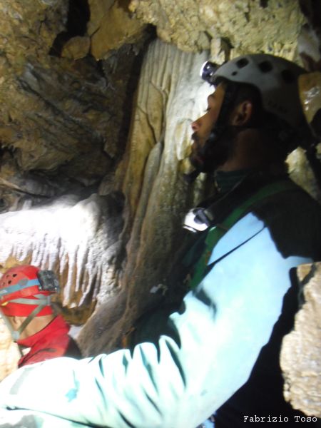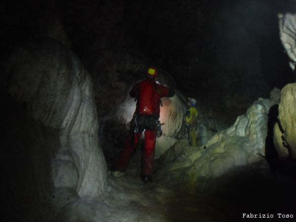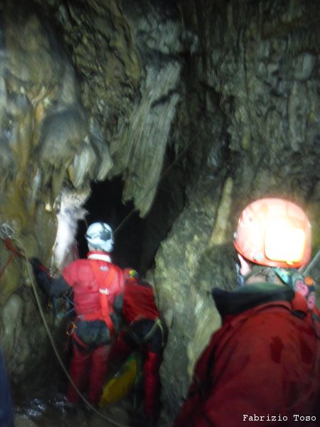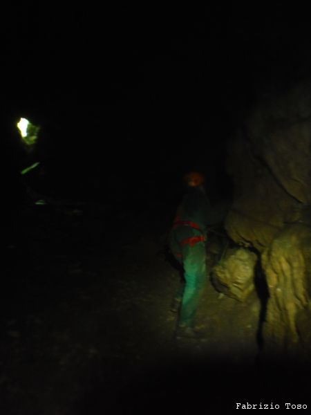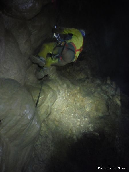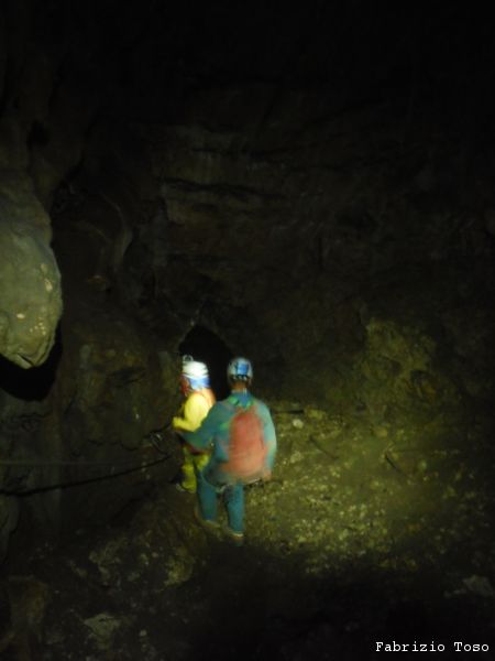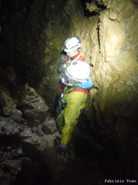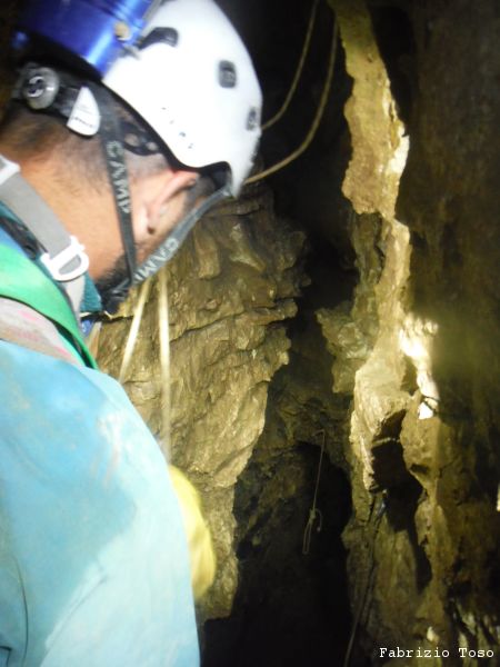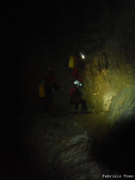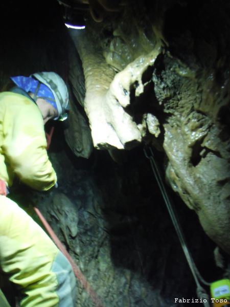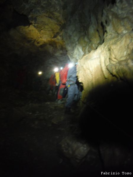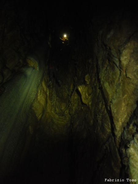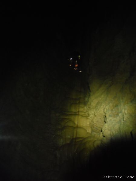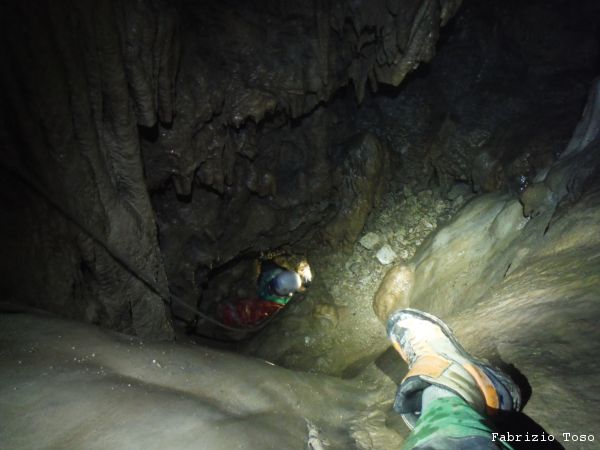 Mentre il gruppo continua a scendere il pozzo noi ci avviamo lungo il ripido scivolo che ci si presenta davanti.