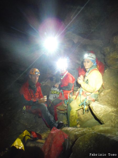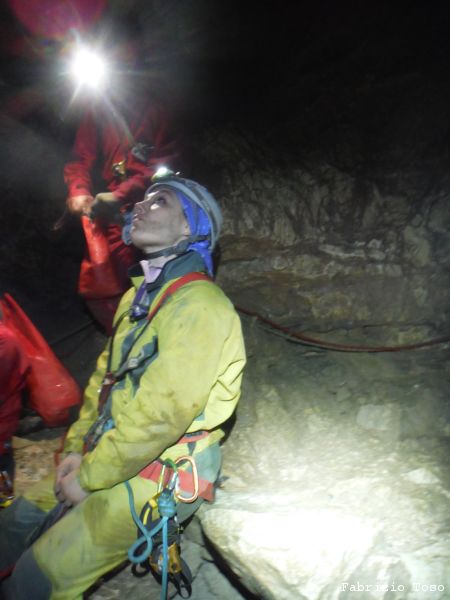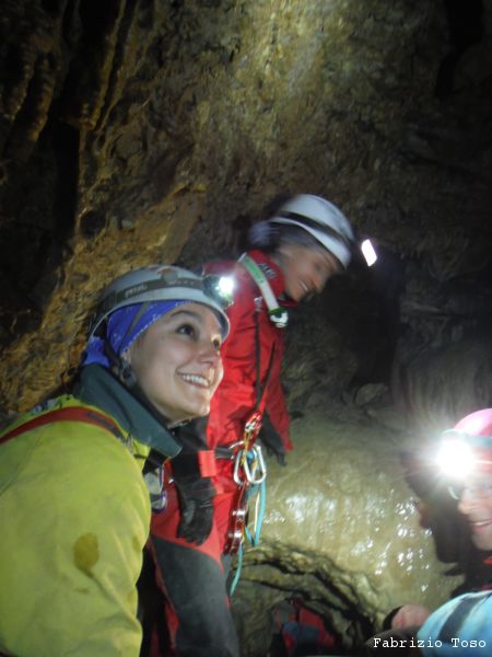 Si arriva al terrazzino che prelude al resto del pozzo. Qua Barbara e Stefania guardano di cosa si tratta ma poi, per non rischiare di essere tradite dalla stanchezza sulla via del ritorno, iniziano a tornare indietro. Infatti in fondo al pozzo che hanno visto appena la nostra gita sara’ terminata e tutti quanti prenderemo per l’uscita.