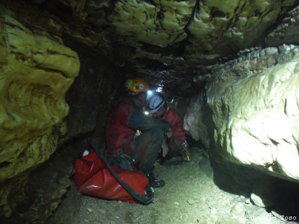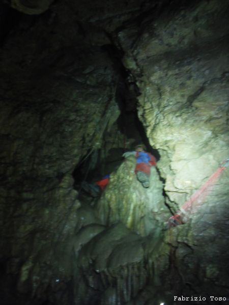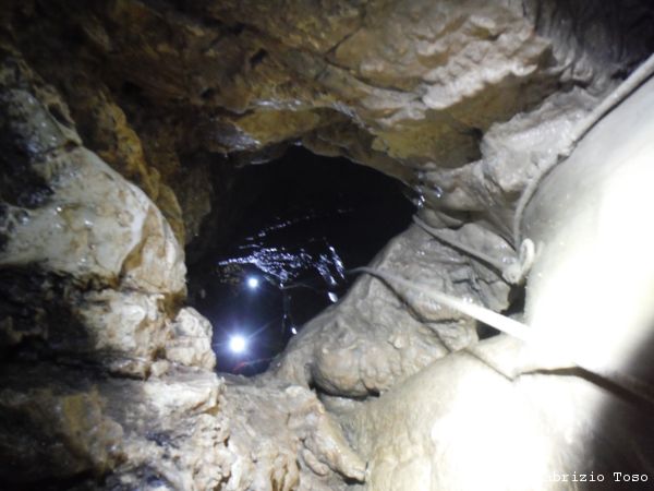 Si inizia a scendere con cautela, il fondo dello scivolo iniziale e’ scivolosissimo. Dall’ingresso traversiamo fino alla parete opposta dove e’ stato attrezzato un traverso con il cavo d’acciaio.