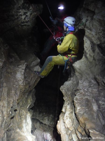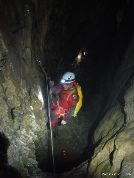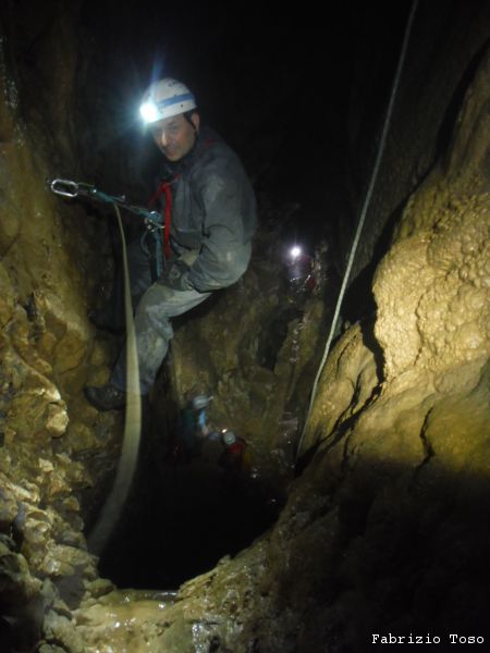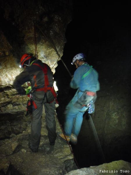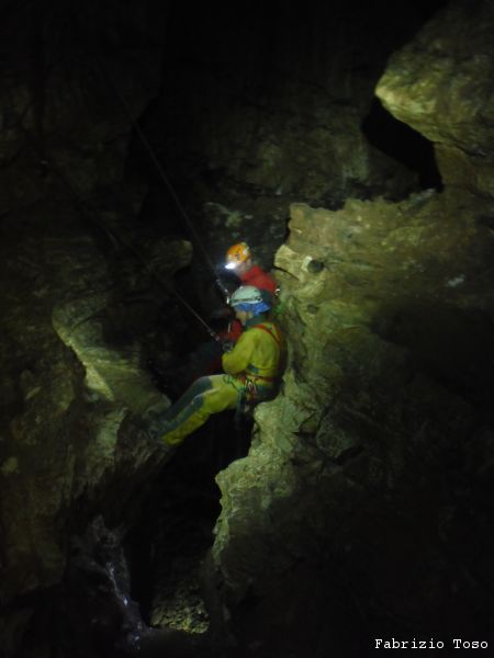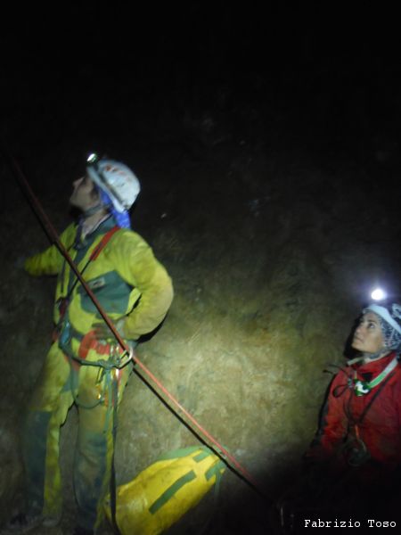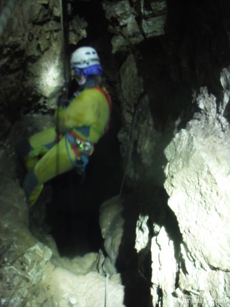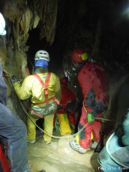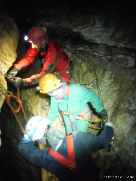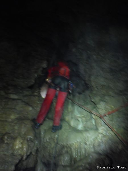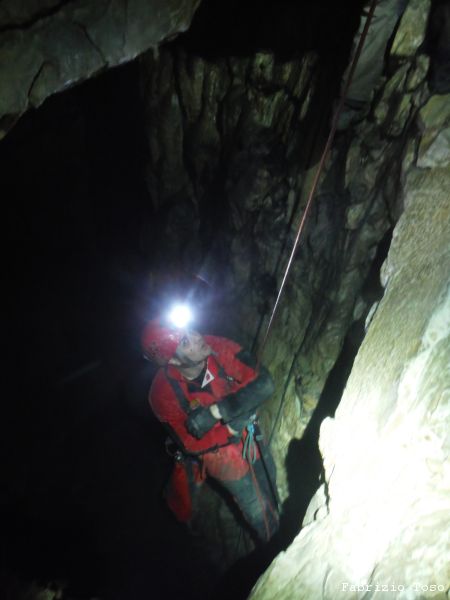 Al pozzo successivo trovo Giorgio, e’ scatenatissimo, sale, scende, da’ istruzioni agli allievi, indica agli istruttori cosa fare. Alla fine di una raffica di disposizioni, io mi trovo sul terrazzino a meta’ pozzo a fare assistenza al frazionamento mentre Giorgio risale il pozzo in arrampicata con la stessa naturalezza con cui io salgo le scale di casa. Alessandro intanto attende il suo turno per passare il frazionamento e proseguire.
