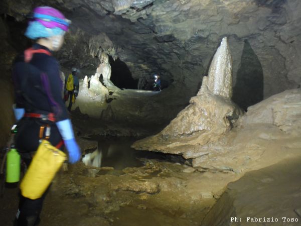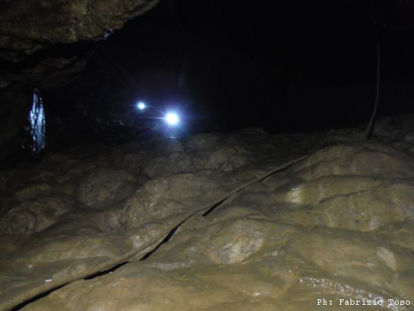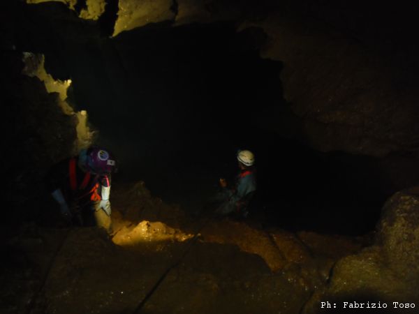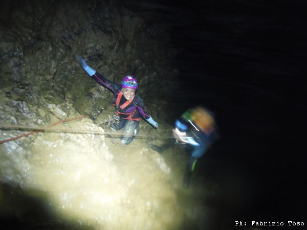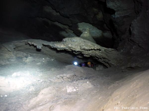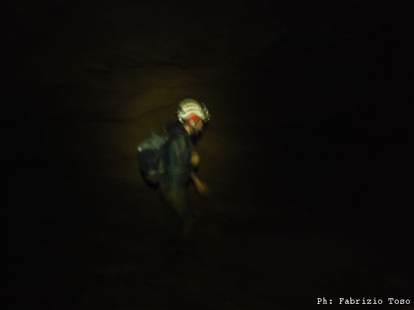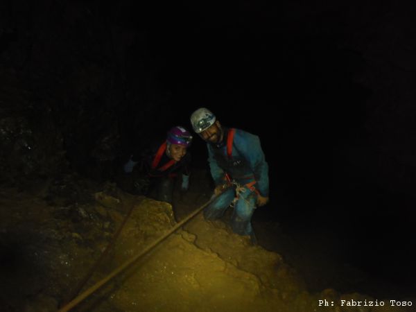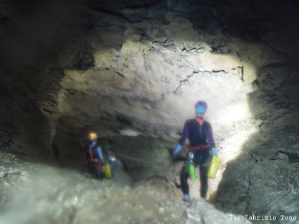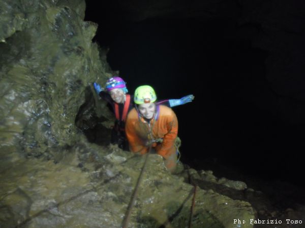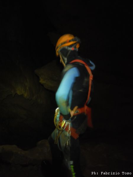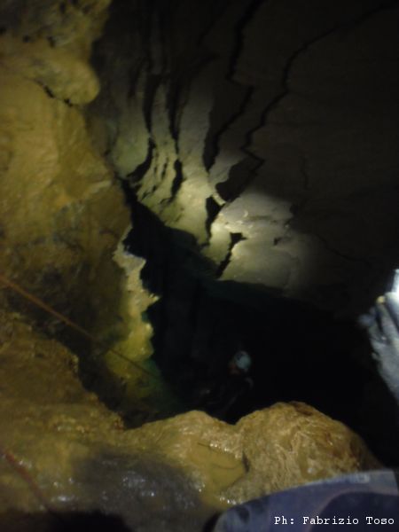 Scendo di nuovo verso il sifone per accompagnare Costanza, Rosa e Fedele. Non che ne abbiano bisogno, ma un poco di movimento e’ utile per farmi passare quel velo di freddo che sento. Dal piano di sopra il buon Gabriele sente addirittura caldo e mette in mostra il petto.