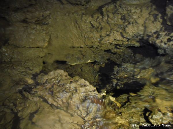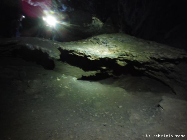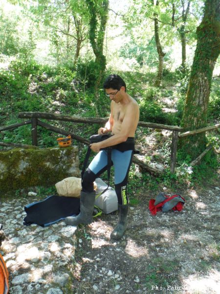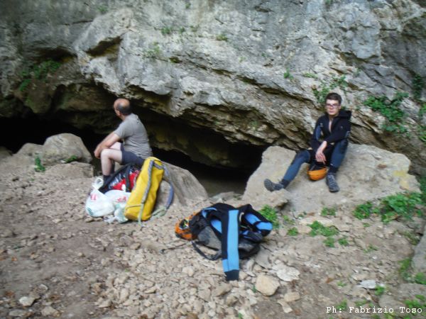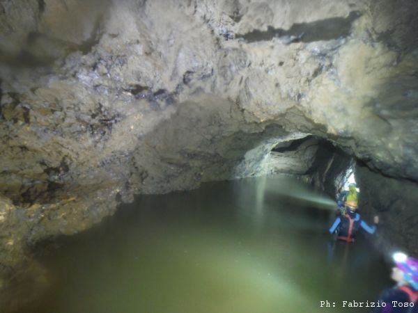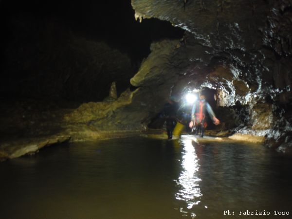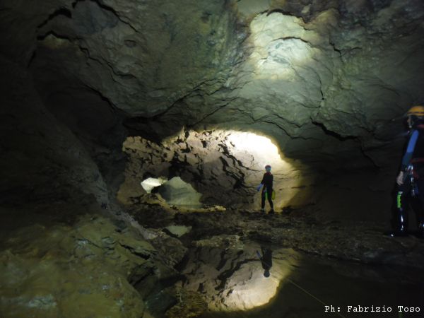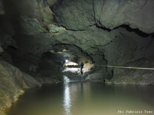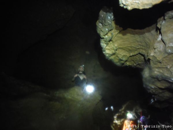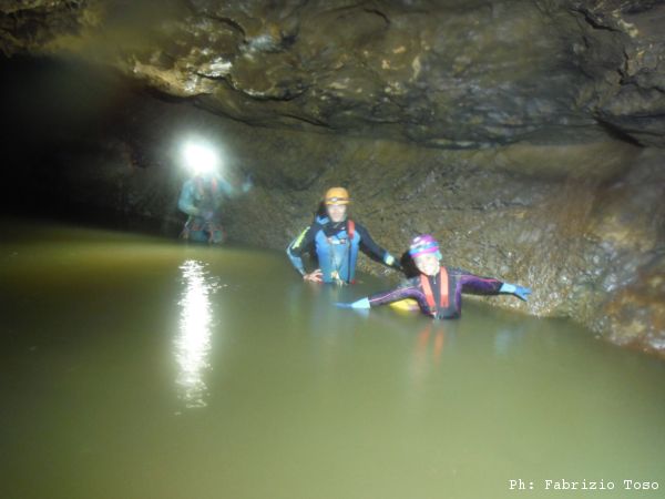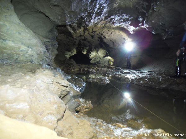Scendo di nuovo verso il sifone per accompagnare Costanza, Rosa e Fedele. Non che ne abbiano bisogno, ma un poco di movimento e’ utile per farmi passare quel velo di freddo che sento. Dal piano di sopra il buon Gabriele sente addirittura caldo e mette in mostra il petto.