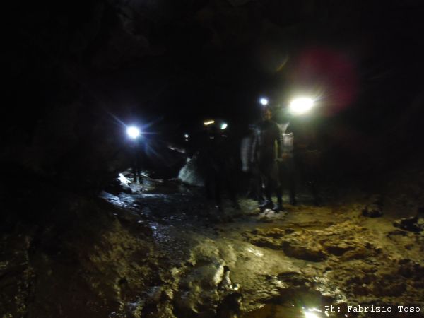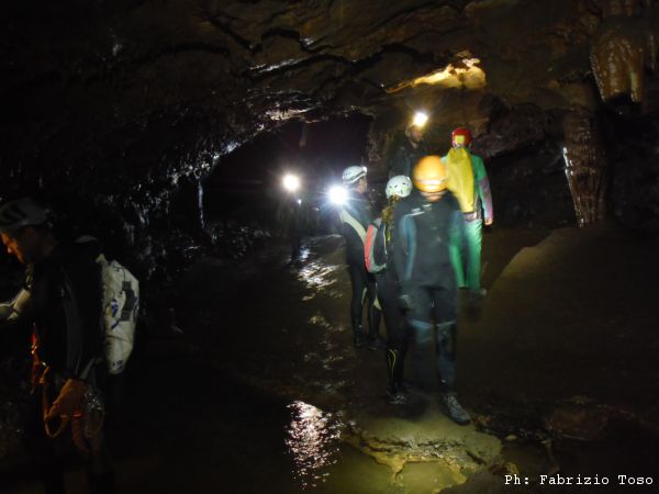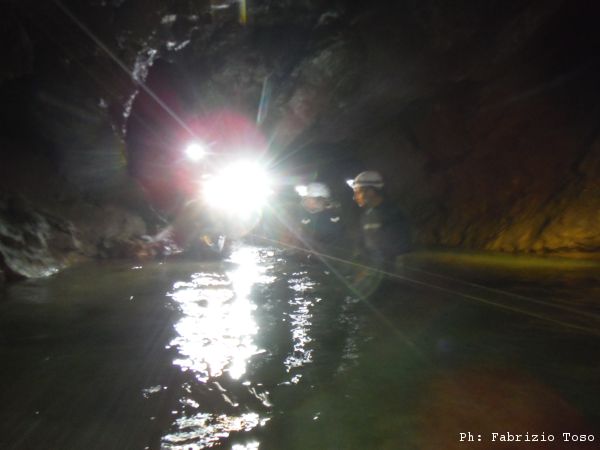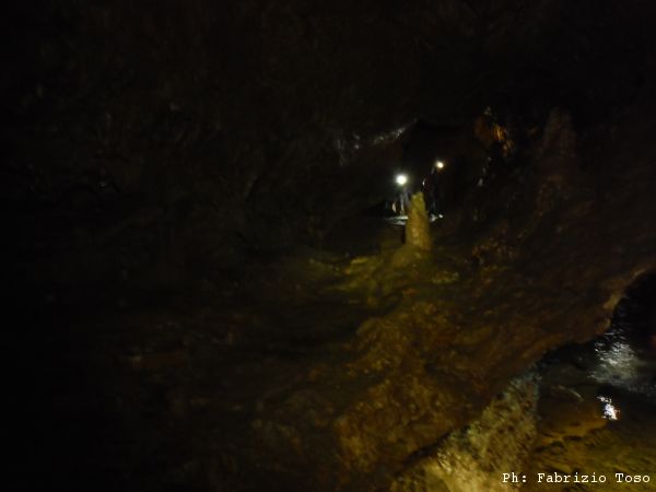 Proseguiamo a gruppetti. Io mi trovo in quello avanti con tutti i ragazzi del GSCAI. Gli altri restano indietro per gustarsi la grotta e fare compagnia a Gabriele che raccoglie i dati sull’acqua.