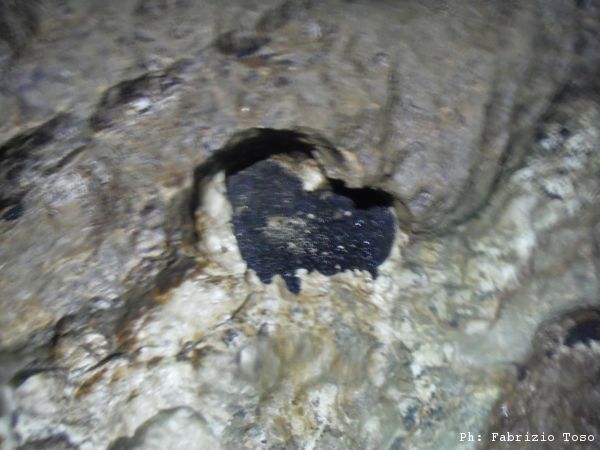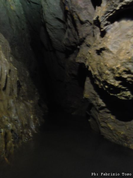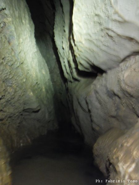 Mi infilo nella spaccatura…gia’ da lontano si intuisce che chiude alcuni metri davanti a me. Dove sono ora ci entro a malapena con le spalle. Tasto in giro con i piedi, ai lati, circa 1 metro sotto il pelo dell’acqua le pareti si allontanano di parecchio. Probabilmente il passaggio comodo e’ ancora piu’ in basso.