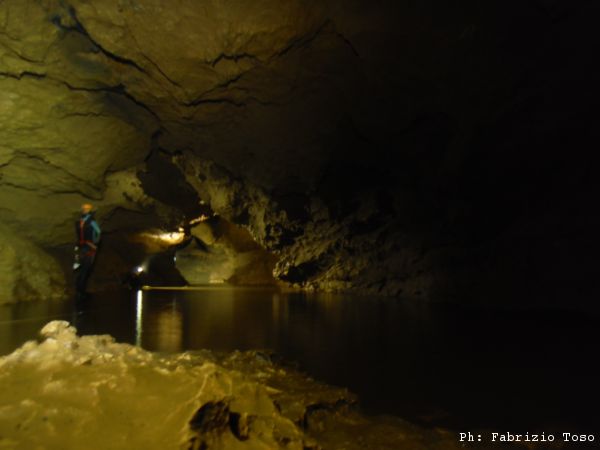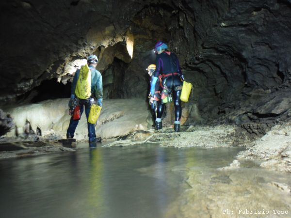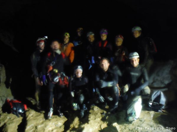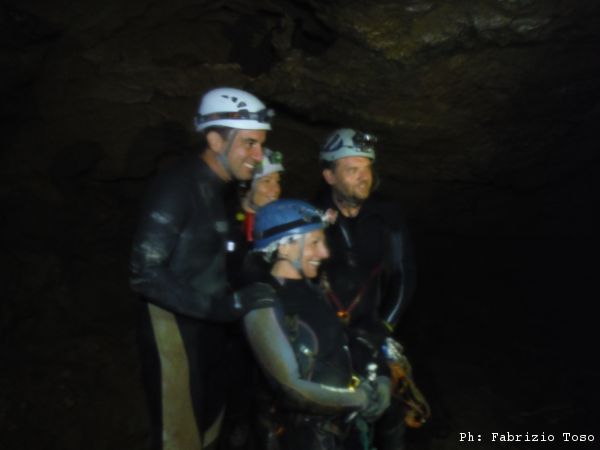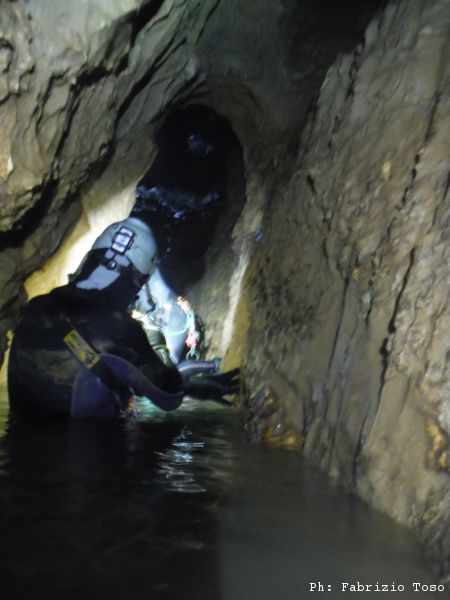 L’acqua fredda e qualche brivido mi convincono che e’ l’ora di uscire. Torno svelto alla base dove intanto sono arrivati in nostri “gemelli” e si stanno preparando a scendere per una visita di cortesia al sifone.