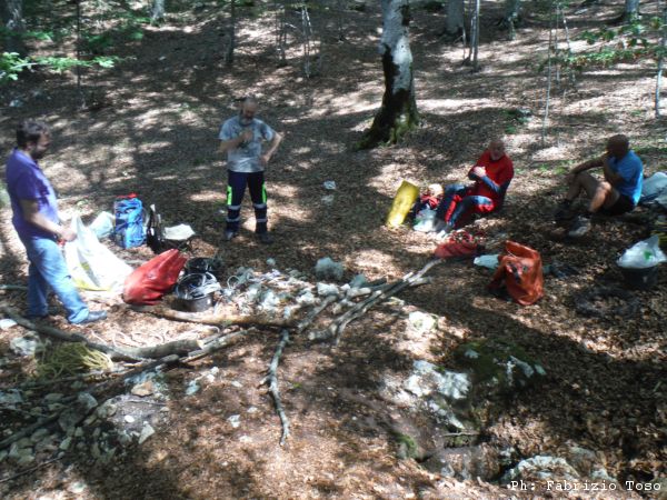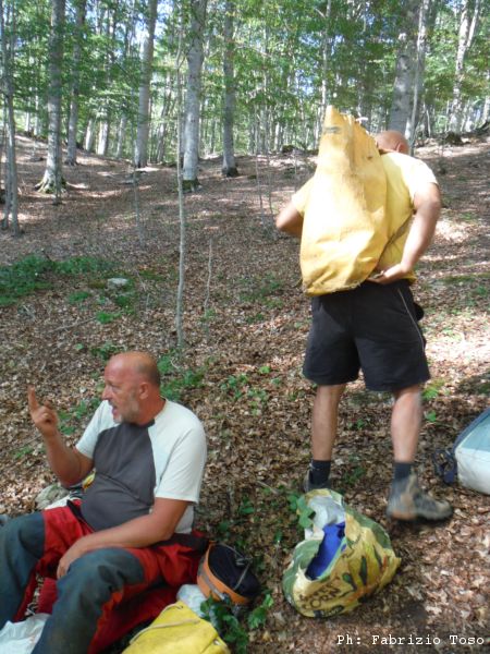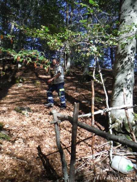 Nella pausa il buon Nerone ci inizia con pazienza all’arte di costruire una palizzata attorno alla grotta per impedire che gli animali al pascolo vadano a caderci dentro. Imparo anche qualche parola in subbiacciano che non fa mai male. In particolare facciamo ampio uso di filagni e ci aiutiamo con lo stringo’! Alla fine il risultato e’ visivamente quasi decente. Dal punto di vista della stabilita’ e robustezza, molto meno. Nerone evita di criticare apertamente la nostra opera prima ma il suo sguardo ci dice che abbiamo meritato una sufficienza stiracchiata in “recintologia”.