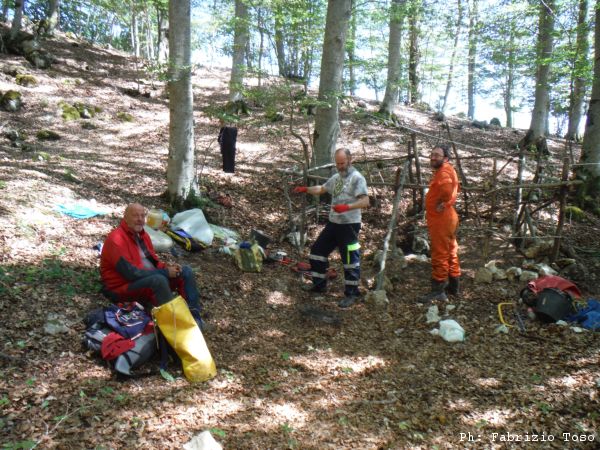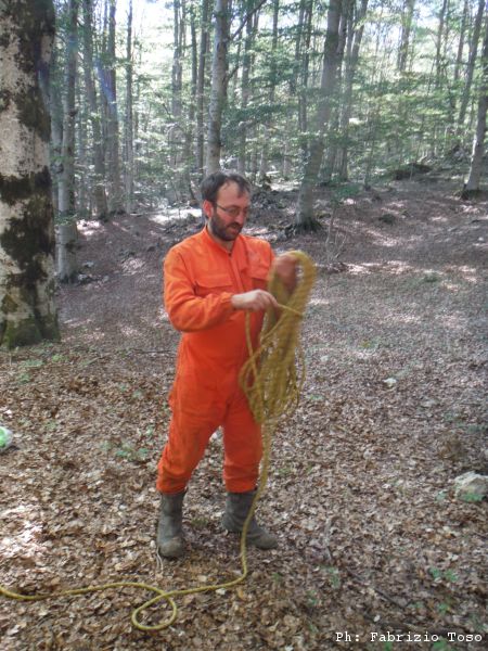 Continuiamo a scavare come forsennati per almeno un’altra ora. Dopo tanti secchi ci arriva una supplica da fuori. Hanno le braccia “finite” non ce la fanno piu’ a tirar su nulla. A malincuore iniziamo a smobilitare. Le ultime fatiche sono dedicate a tirar su tutti gli attrezzi da scavo che avevamo portato giu’. Esco buon ultimo, stanco ma soddisfatto, qualcosina abbiamo trovato e magari la prossima volta… Mentre mi riposo e mi cambio faccio un rapido giro di foto, una per Maurizio col passo da boscaiolo.