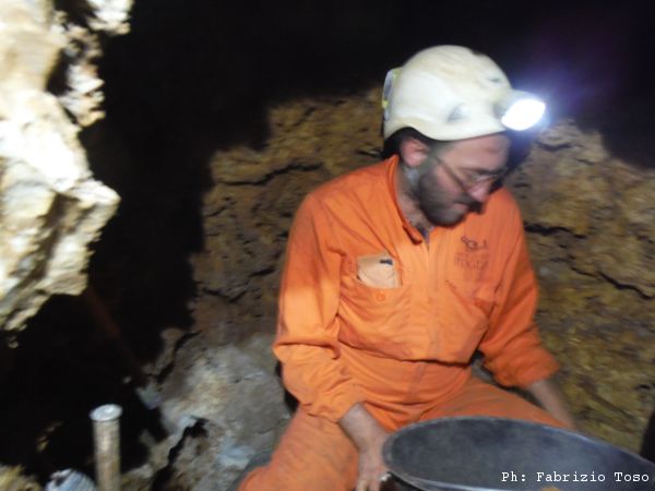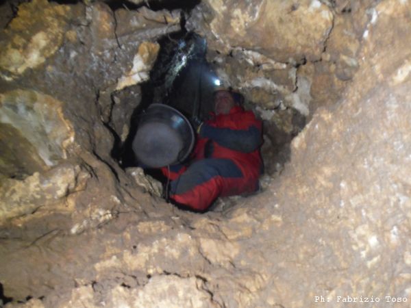 Dopo la pausa ludico-formativa, riprendiamo i lavori ipogei. Torno giu’ armato delle migliori intenzioni e di tutti gli attrezzi necessari. Tempo una mezz’ora ed abbiamo ricavato un passaggio comodo, largo abbastanza anche per Mario. Decidiamo di allargare anche il buco, almeno quel tanto da infilare la testa e vedere cosa nasconde. Finito di allargare, mi infilo con la testa dentro e scruto. Mi ritiro un poco deluso. Non si vede alcuna prosecuzione evidente. Decidiamo che vale la pena controllare anche l’altro buco, quello che in origine era parzialmente occluso dai sassi. Ora da quel lato la situazione e’ peggiorata, in quello che era un possibile buco, ora c’e’ tanta terra. Decidiamo che e’ il momento di tirare fuori terra e sassi. Gabriele mi raggiunge nella nuova saletta, gliela presento e poi entriamo in azione. Gabriele si occupa di caricare le cofane di terra e sassi, io sono a meta’ strada per agevolarne la partenza, in cima si sistema Mario e fuori Nerone e Maurizio operano di forza bruta per recuperare i pesanti secchi.
