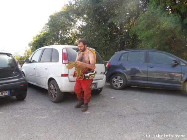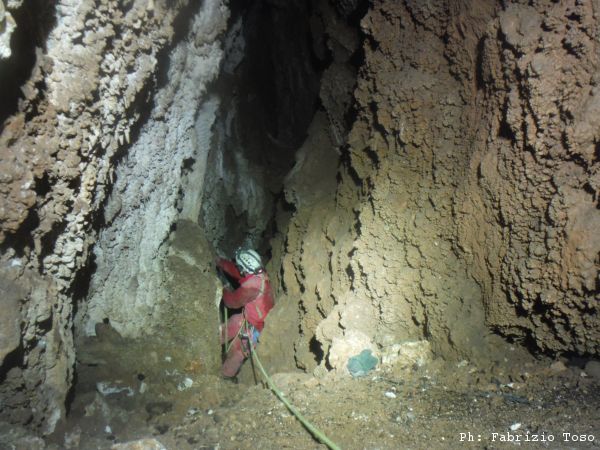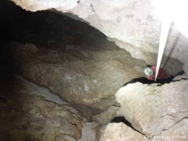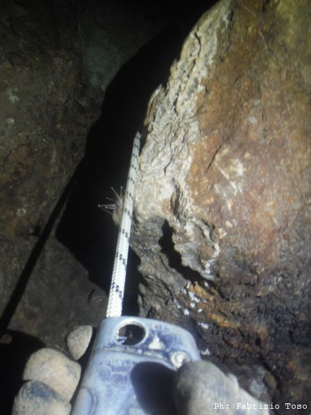 Uscendo troviamo un altro punto interessante. L’aria qua soffia, ci piace. Per oggi possiamo fare poco, abbiamo terminato le corde. La prossima volta torneremo meglio attrezzati per passare oltre.