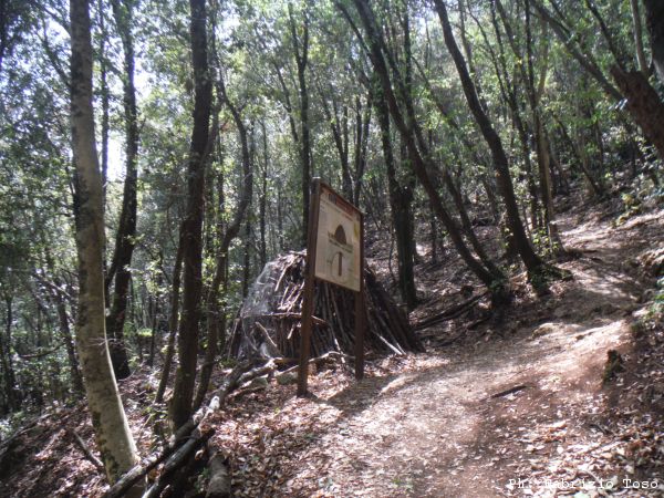 Dopo un tratto in piano prendiamo il sentiero che porta agli eremi. La copertura degli alberi ci assicura un minimo di riparo dalla calura.