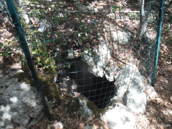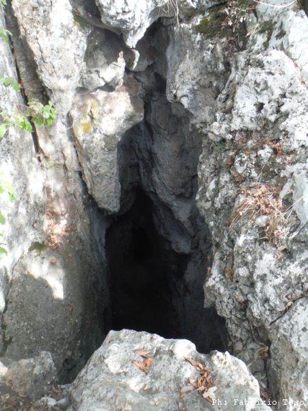Piccola deviazione, andiamo a dare uno sguardo all’ingresso della grotta di San Sebastiano. Visto che in inverno soffiava, ora mi aspetto che aspiri. Visto che si tratta solo di una visita all’ingresso, lasciamo gli zaini con le attrezzature vicino alla panchina.