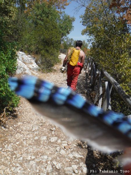 Dopo una lunga sosta alla fontanella, riprendiamo il cammino, oramai manca poco. Per terra trovo una bella penna colorata, chissa’ di quale uccello sara’?