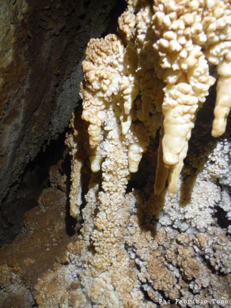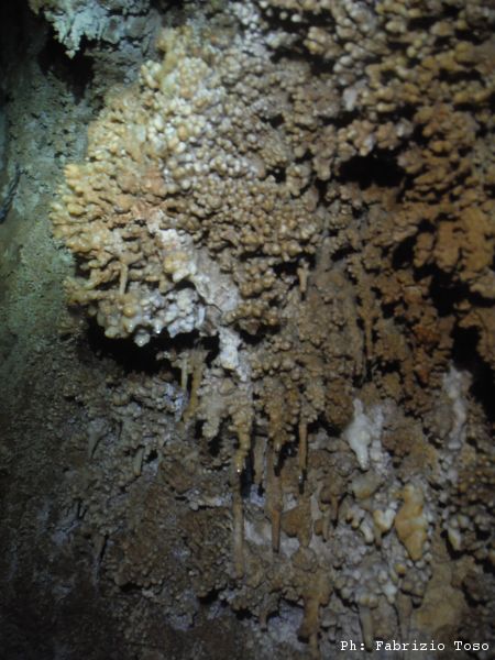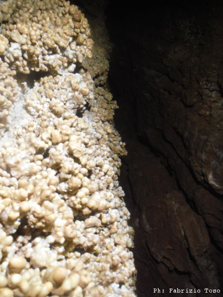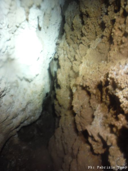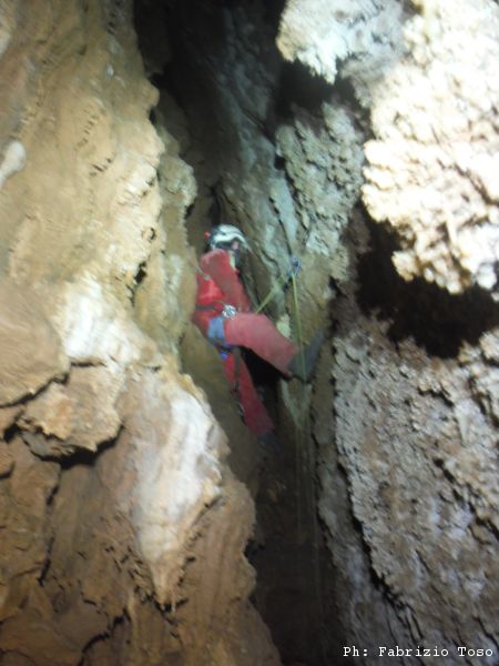 Scendiamo rapidamente lungo il sentiero fino a rientrare sotto gli alberi. Un paio di tornanti e siamo al bivio per l’Erebus. Davanti all’ingresso ci prepariamo svelti e scendiamo al fresco della grotta. Gia’ scendere il primo pozzetto iniziale e’ di gran sollievo. Camminando verso il pozzo succesivo noto una farfalla. La forma ed i colori mi ricordano qualcosa ma rimando ulteriori indagini a piu’ tardi (in effetti dopo, a casa, ho ricordato di aver visto farfalle simili all’isola di Rodi. Si tratta della Panaxia Quadripunctaria, o qualcosa di molto simile, che si trova in migliaia di esemplari in un parco dell’isola di Rodi che ho visitato tanti anni fa)