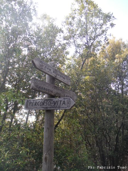 Per il ritorno non torniamo in cima rifacendo il percorso dell’andata ma prendiamo a sinistra e continuiamo per il sentiero. Sicuramente stiamo allungando ma almeno e’ tutta discesa. Al bivio prendiamo per il sentiero che indica per il percorso vita.