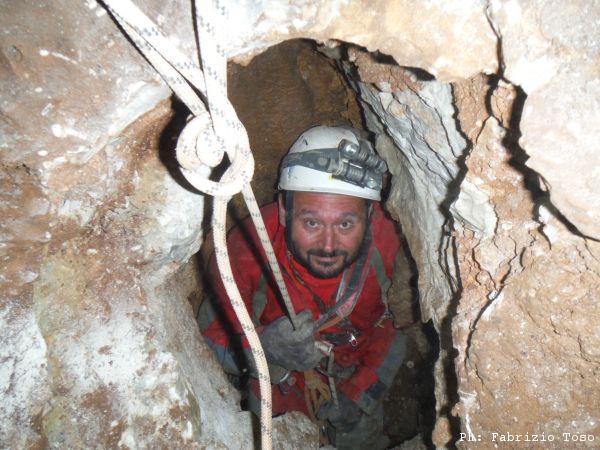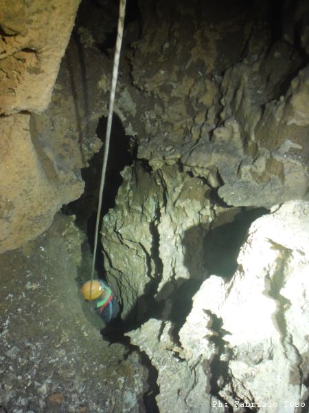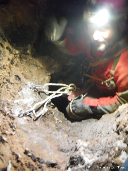Per fortuna si tratta di un mucchio di sassi che si tolgono facilmente e con l’aiuto di Maurizio in pochi minuti abbiamo ricavato una apertura utile a continuare. Sotto di noi c’e’ un saltino di un paio di metri ed un’altra sala minuscola. Anche la saletta sotto di noi sembra non avere prosecuzioni, ma oramai abbiamo capito il trucco e non ci allarmiamo piu’ di tanto. Decidiamo di armare il saltino. Maurizio provvede a mettere un fix che doppiamo con un cordino su naturale. Armiamo la discesa con l’avanzo della corda con cui siamo scesi fin qua. quando tutto e’ pronto, scendo.