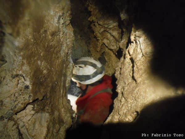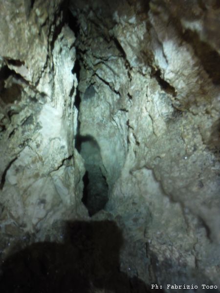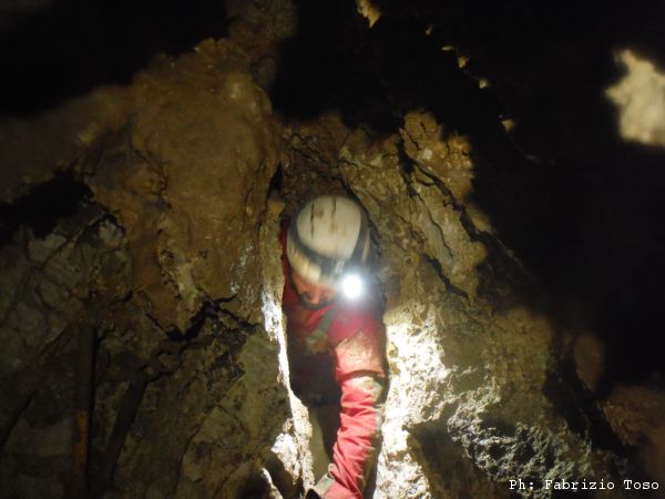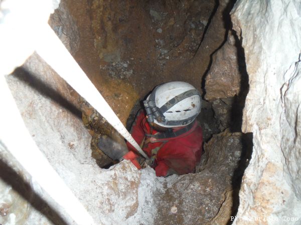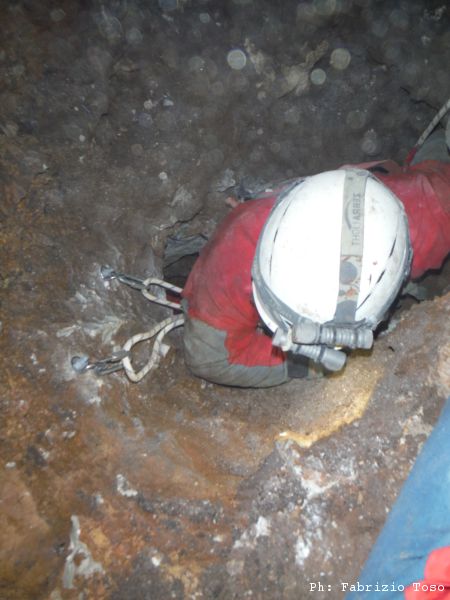 Inizio a scendere. Sotto di me c’e’ una cengia e per continuare a scendere dovro’ spostarmi di lato di almeno un metro. Cerco un posto per un deviatore. Una concrezione forma un attacco naturale che sembra fare al caso nostro. Maurizio mi passa un cordino e provvedo. Per il momento sembra buono, poi vedremo. Arrivo sulla cengia di terra e continuo l’opera di pulizia. La discesa, come avevo visto, continua ad un metro da me. Le pareti della grotta si avvicinano a formare un laminatoio verticale. Le pareti pero’ sono lisce e distano tra loro almeno 40cm, non dovrebbe essere un problema passare. Ci provo. Il passaggio stretto e’ di pochi centimetri quindi me la cavo con solo pochi sbuffi e lamenti. Dopo il breve punto stretto mi ritrovo in una sala a pianta grossolanamente ovale. Avverto Maurizio ed inizio a guardarmi attorno.