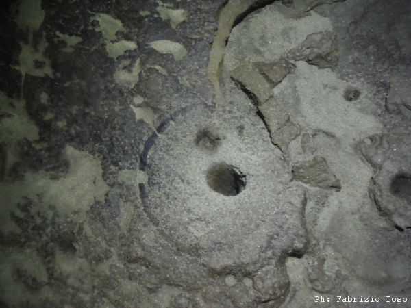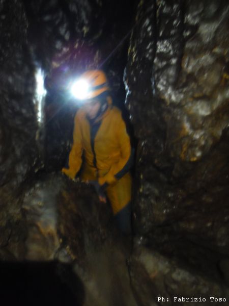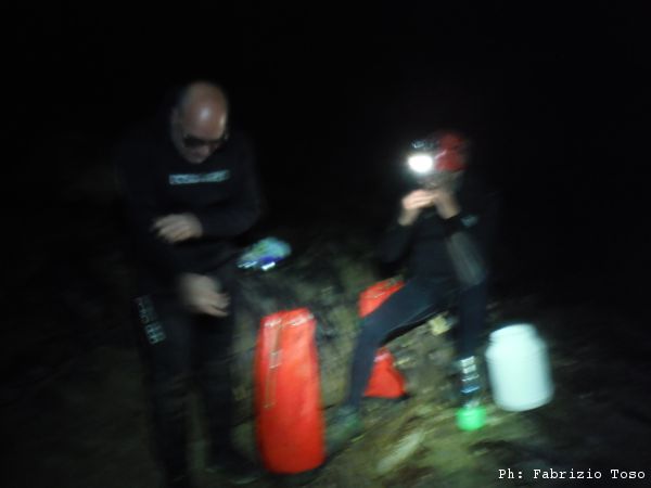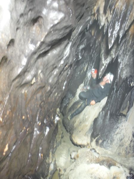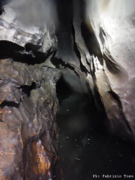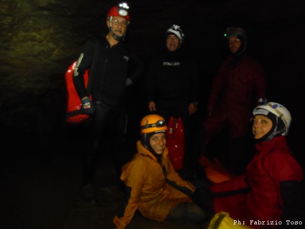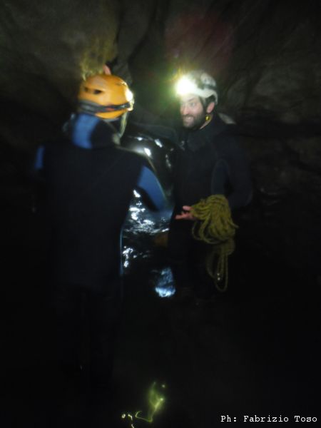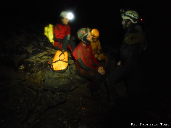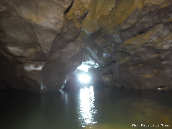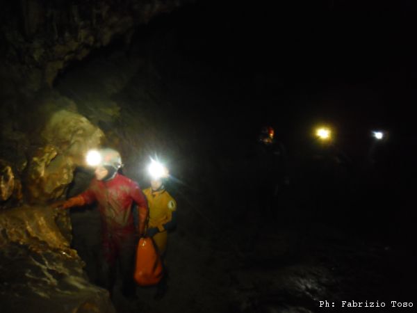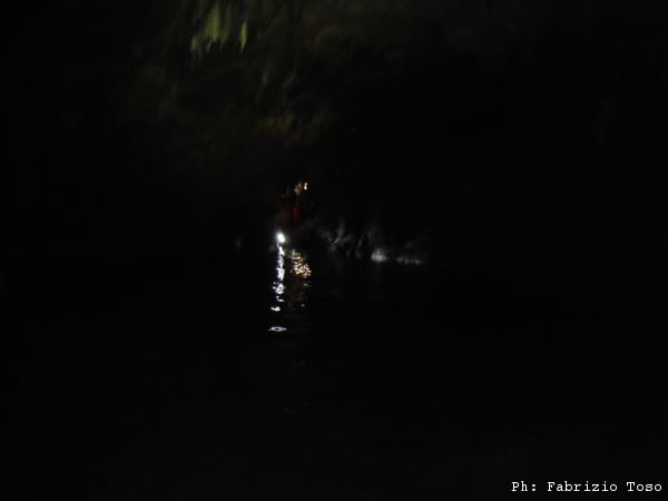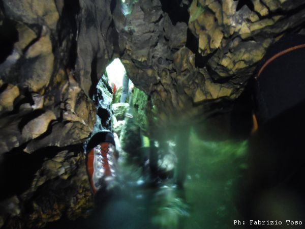 Entra per primo Giuseppe, Gabriele sara’ tra gli ultimi, a chiudere la fila. Mentre nuotiamo per superare il primo tratto il buon Giuseppe ha un inconveniente, gli si sfila dal piede uno stivale e non riesce a riacciuffarlo prima che vada a fondo. Arriva quindi all’approdo letteralmente “con una scarpa ed una ciabatta”. Gabriele ed io parliamo con Giuseppe per convincerlo a proseguire ugualmente, nelle nostre precedenti esperienze questa grotta si nuota quasi tutta quindi anche solo con i calzari della muta potrebbe farcela. Giuseppe pero’ oramai e’ deciso ad uscire e non riusciamo a fargli cambiare idea. Appena il gruppo parte per andare avanti lui prende la via per l’uscita con l’aiuto di Gabriele.