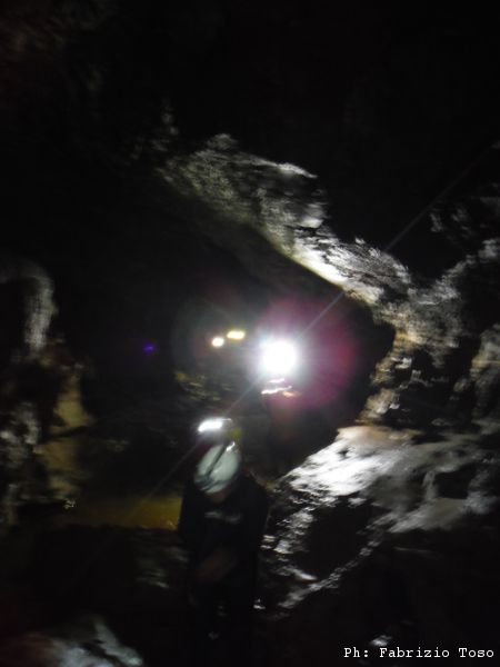 Dopo tanti tanti minuti, finalmente sono tutti pronti e li vedo avvicinarsi all’imbocco della grotta. Il primo tratto di grotta e’ allagato e di solito lascia sconcertato chi non la conosce poiche’ non e’ immediato capire dove dirigersi. Cerco quindi di dare loro qualche indicazione affinche’ entrino in rapida sequenza, ognuno dando indicazioni a chi lo segue.