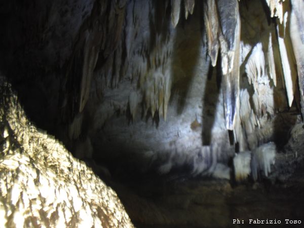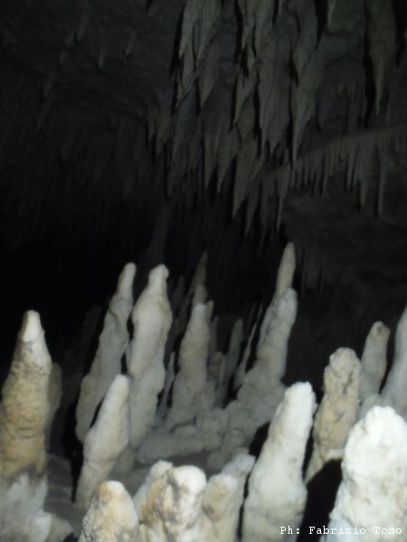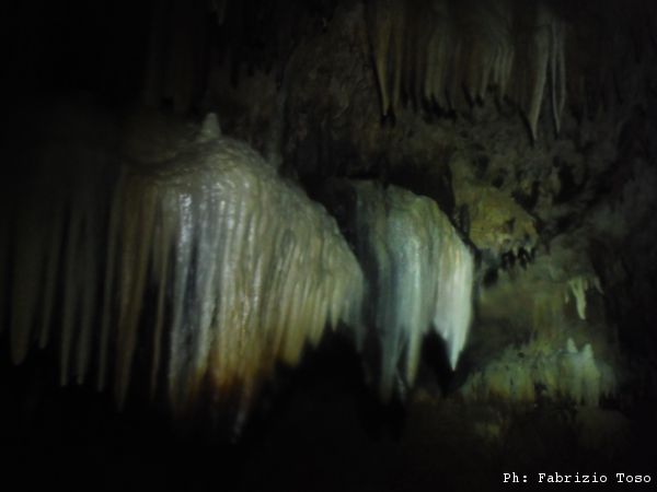 Come sempre mi tengo sulla sinistra dell’ampia galleria che porta al sifone. Il passaggio e’ piu’ in alto del livello normale dell’acqua e quindi c’e’ una interessante zona di concrezioni. Sono all’asciutto da chissa’ quanto tempo ed hanno un aspetto polveroso.