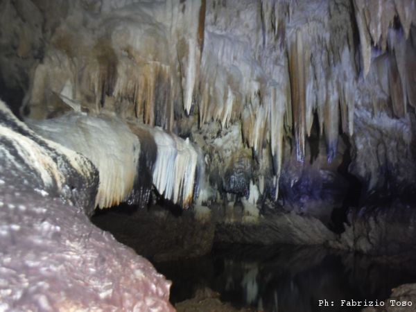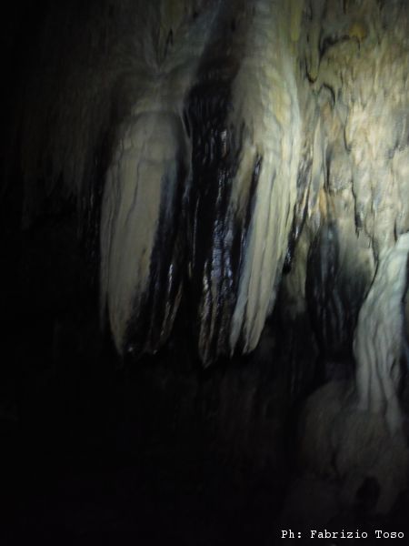 Da quel punto in poi iniziamo a camminare. Dei laghetti successivi, anche molto lunghi rimangono misere pozze o nulla del tutto. In compenso sono rimaste le splendide concrezioni in bianco e nero. Scatto una foto al volo per non perdermele ma come sempre senza grandi risultati.