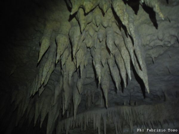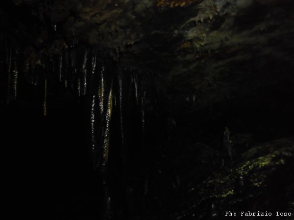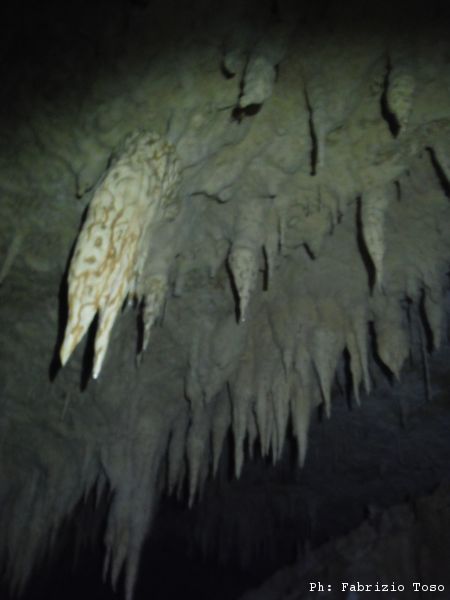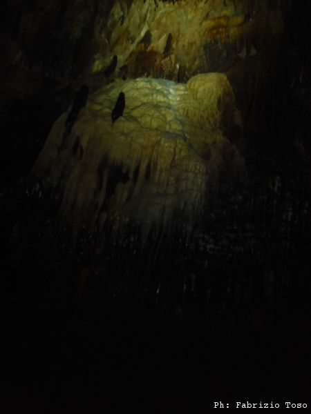 Sul soffitto le stalattiti sono ricoperte da una decorazione di fango a macchie.