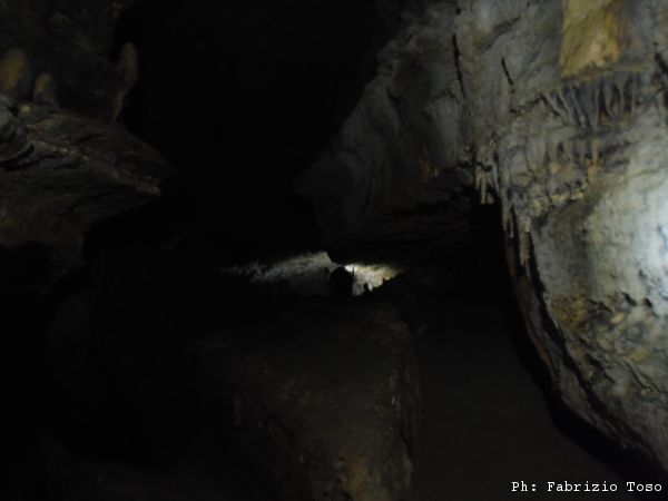 Questo e’ il punto in cui solitamente si nuota e si passa al laghetto successivo tramite un passaggio che si raggiunge con una breve arrampicata in roccia. All’andata ho invano cercato il passaggio che ricordavo. Solo al ritorno mi accorgo di esserci passato sotto! Il passaggio in roccia e’ ora quasi 4 metri sopra di noi. Decisamente una esperienza singolare vedere la grotta in questa versione asciutta.