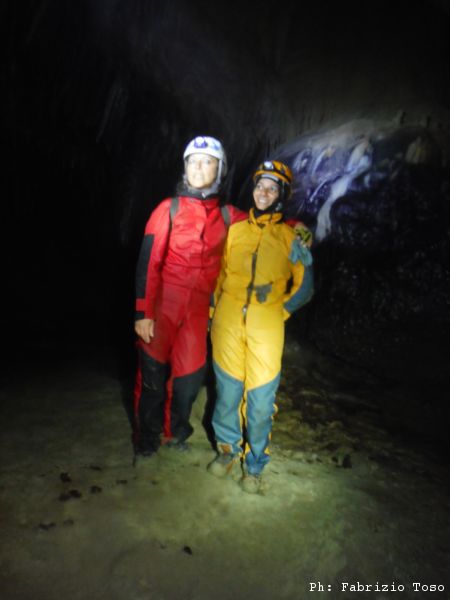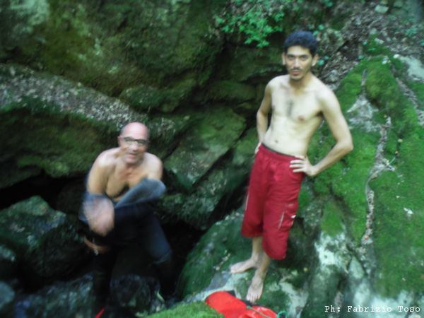 Io mi bardo velocemente, termino quindi la vestizione molto prima degli altri. Inizio subito a sudare copiosamente, il colpo di calore non e’ da escludere se rimango fermo a prendere caldo. Avviso il gruppo e vado a rifugiarmi nel primo tratto di grotta. E’ allagato e posso immergermi per equilibrare la temperatura interna.