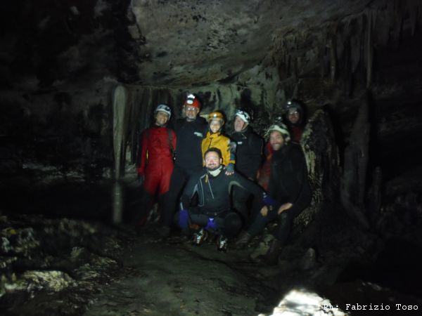 L’attraversamento del laghetto tempra il gruppo alle acque gelide della grotta. Passata questa prova si meritano una bella foto di gruppo.