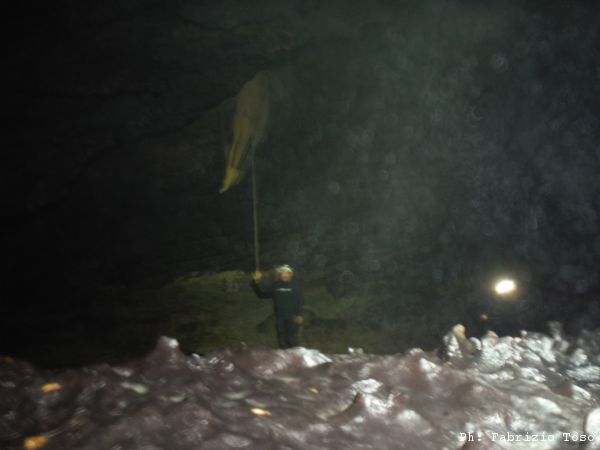 Arriviamo finalmente alla sala con la risalita per il sifone pensile. C’era l’intenzione di fare la risalita ed andare a vedere il livello del sifone. Ci fermiamo per sondare i desideri del gruppo. Per il momento non sembra ci sia molto entusiasmo al riguardo. Magari al ritorno. Lasciamo la sala diretti al sifone terminale.