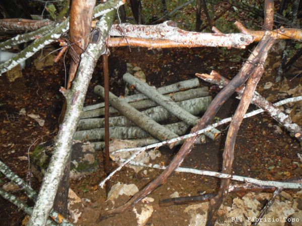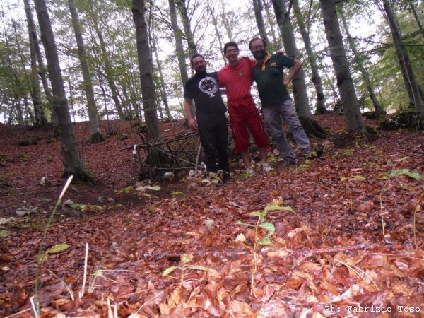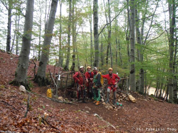 Ma facciamo un passo indietro. Questa estate Gabriele Catoni, socio SZCS e instancabile PR della speleologia italiana, ha stretto un gemellaggio con un gruppo pugliese, e per sugellare il sincretismo cultural-grottarolo ha organizzato un bel campo estivo sui monti Simbruini. Il luogo prescelto è assai strategico: c’è una meravigliosa faggeta pianeggiante, raggiungibile da una breve sterrata, a pochi chilometri dai bar e dagli alimentari di Livata, a poche decine di metri dall’ingresso di una bella grotta come il Pozzo della Creta Rossa, e soprattutto vicino ad un bucaccio nella terra trovato da Alberta Felici tanti anni fa dove adesso tocca scavare… i lavori durante il campo hanno sortito gli effetti desiderati e così, dopo aver estratto alcune centinaia di callarelle piene di terra e aver dato una mano con mazzetta, scapello e … scalpelli, il bucio ha ceduto il passo agli speleologi in entrata e all’aria in uscita. In breve gli amici Shakazuli hanno percorso una serie di passaggetti discendenti, fino a raggiungere la partenza di un pozzo da 25m, seguito dal baratro di cui sopra… E’ a questo punto della storia che Nerone mi chiama minacciandomi che, ove mai non fossi andato a vedere le nuove scoperte, mi avrebbe spezzato un tronco sulla schiena!! Così sollecitato non mi son potuto sottrarre, ho coinvolto i consoci castellani liberi per un’uscita domenicale e ci siamo recati sul posto.