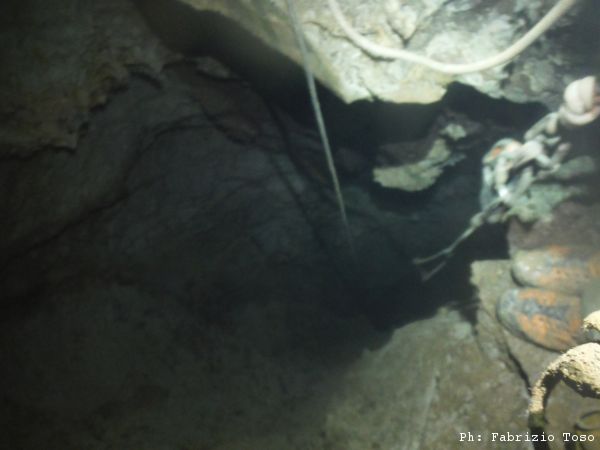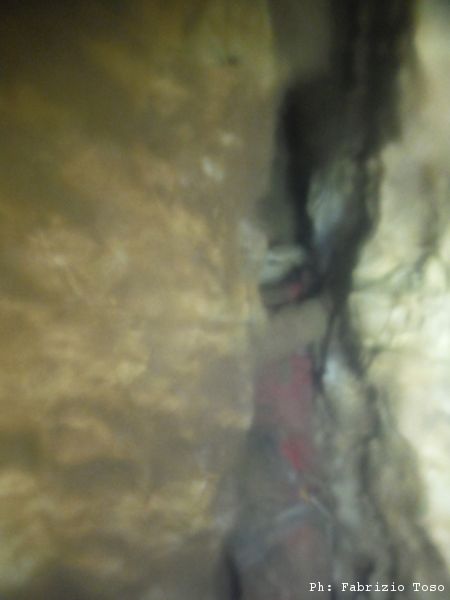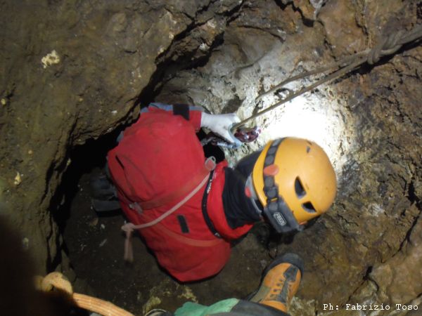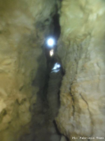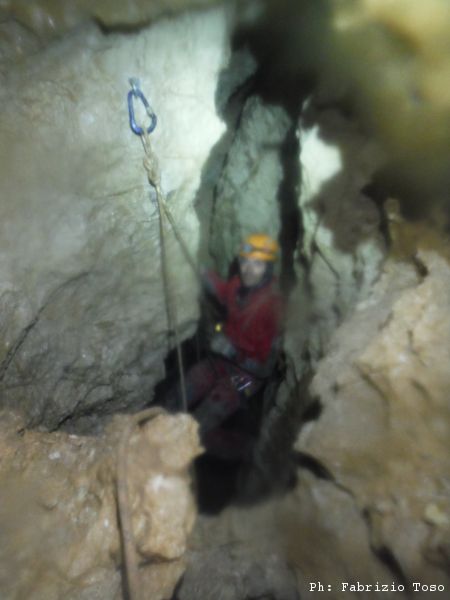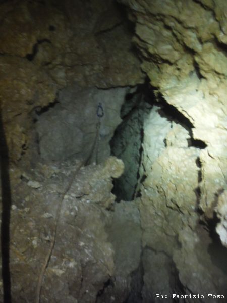 Di nuovo parte Giuseppe per primo. Mentre si guarda intorno prima di iniziare a scendere il buon Giuseppe trova un passaggio alla sinistra della partenza del pozzo. Non e’ facilmente percorribile, pero’ potrebbe essere interessante andare a sbirciare piu’ da vicino cosa c’e’ in fondo.