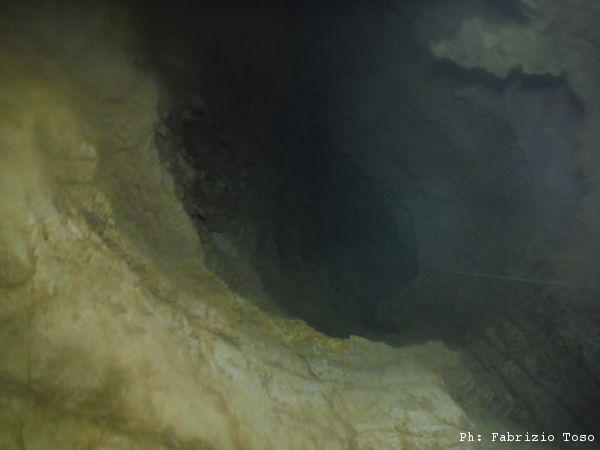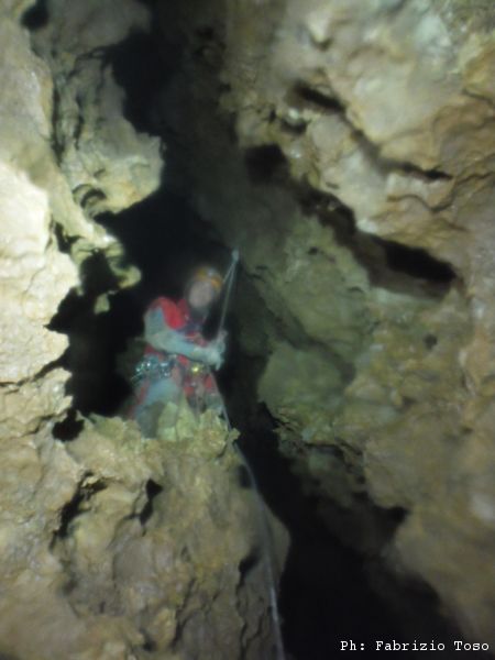 Finalmente arriviamo sul fronte esplorativo. Il baratro viene disceso da Fabrizio, che si ferma una quarantina di metri più in basso su un terrazzo laterale generato da un arrivo abbastanza importante, che immette nella
