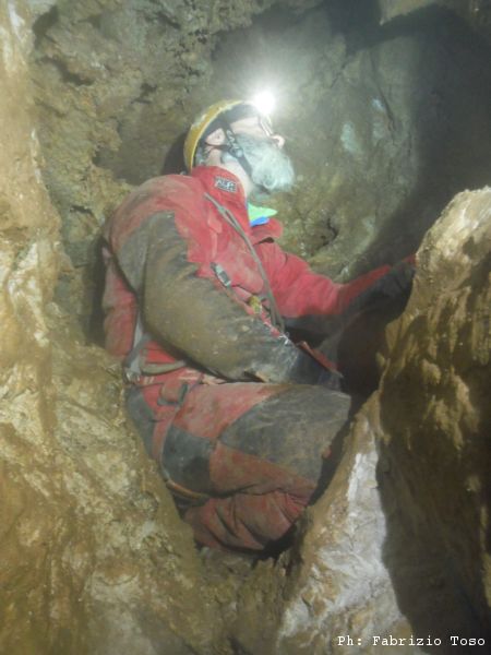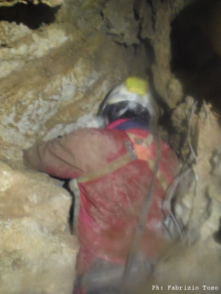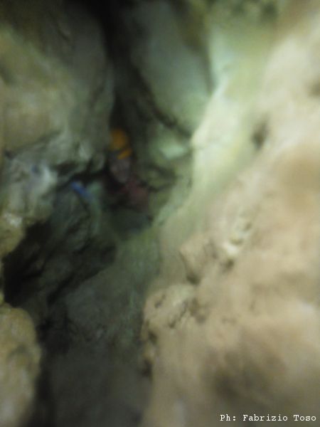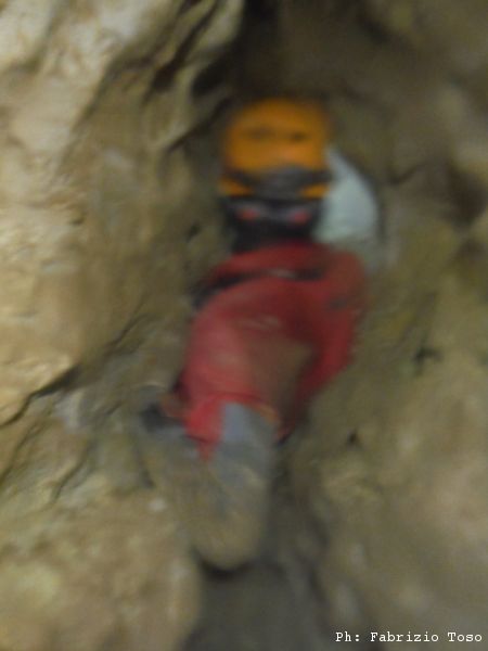 Gli ultimi centimetri da allargare sembrano i piu’ ostici e ci fanno penare assai. Alla fine pero’ ce la facciamo, o meglio, Giuseppe, togliendosi completamente l’imbrago, riesce a passare e ci saluta felice dall’altro lato della strettoia.