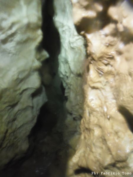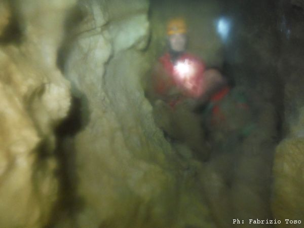 Gabriele ed io proviamo a passare, ma anche strizzandoci al massimo non riusciamo, per fortuna ora Giuseppe dall’altro lato puo’ lavorare con comodita’ e riesce ad allargare abbastanza. Riprovo a passare ancora una volta…niente da fare. Attacchiamo con ancora maggiore decisione la strettoia togliendo gli spuntoni piu’ fastidiosi. In capo ad una mezz’ora posso riprovare e stavolta passo! Non e’ propriamente largo, per me, pero’ e’ fattibile. Per prima cosa vado a vedere dove siamo. Siamo in un tratto di meandro di roccia pulitissima, largo un paio di metri. Verso l’alto si perde nel buio, potrebbe essere interessante fare alcune risalite. Dopo circa 5 metri c’e’ una curva a destra quasi ad angolo retto. Subito dopo la curva le pareti del meandro stringono di nuovo, ma per poco. Dopo lo stretto c’e un piccolo ambiente, subito dopo un altro restringimento e quindi piu’ avanti si intuisce un ambiente piu’ ampio. L’aria si sente arrivare da la’ anche se con meno decisione rispetto alla strettoia appena passata.