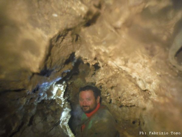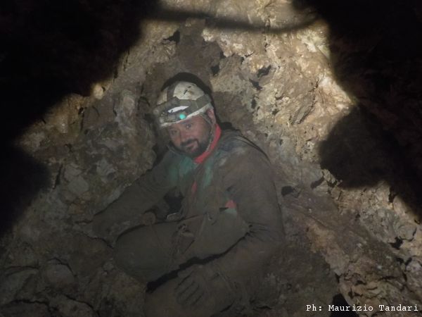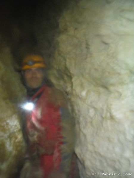 Visto che ci siamo termino il gruppo inserendo la foto che mi ha scattato Maurizio con la sua fotocamera mentre eravamo ancora in grotta. Notare il colore “mimetico” della tuta.