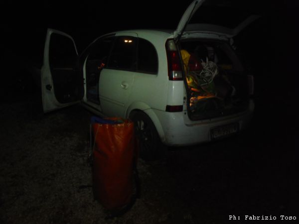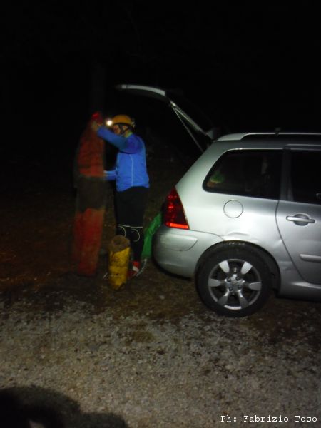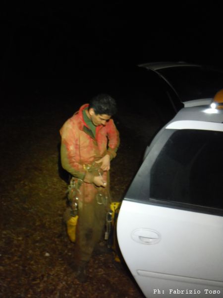 Dopo circa un’ora di attesa inizio a sentire decisamente freddo, d’altronde sono ancora abbastanza bagnato addosso. Ho anche un problema con la tuta che non ne vuole sapere di restare chiusa, il velcro non regge piu’. Maurizio, indomito, decide di rimanere in attesa. Io lemme lemme mi avvio all’uscita. Nel buio della notte mi cambio con molta calma e sistemo nel mio enorme zaino arancione tutto il fango che contorna e nasconde l’attrezzatura. Una volta cambiato dovrei sentirmi meglio, inizio invece a sentire un freddo intenso, tanto da tremare come una foglia. Mi infilo addosso tutti i vestiti che porto per evenienze simili e poi mi chiudo in macchina continuando a tremare. Dopo una lunga attesa, finalmente esce Gabriele. Mi spiega che ha impiegato un poco di piu’ del solito ad uscire perche’ ha avuto difficolta’ con lo zaino.