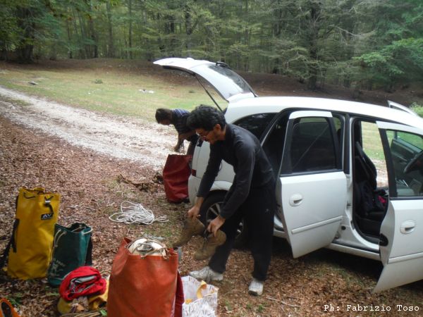 Solito appuntamento sotto casa mia, strada facendo ci fermiamo da “Cicchetti” a fare colazione. A Subiaco facciamo sosta al magazzino a prendere del materiale. Durante la salita a Livata ci arriva il responso di Maurizio, oggi non verra’, deve ancora smaltire del tutto i dolori della uscita precedente. Fatto tutto quel che dovevamo, verso le 11 siamo davanti alla grotta ed iniziamo a prepararci.