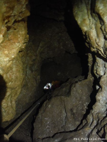 Max va avanti in una corsa solitaria e prima di affrontare il pozzo da 25 metri (circa) sentiamo dall’alto che sta già trapanando per montare nuovi attacchi. Si scende questo pozzo con ancora l’assenza di stillicidio importante, si affronta poi quello da 50 (o 60, secondo punti di vista personali) e ci si ritrova tutti e tre alla saletta alla base.