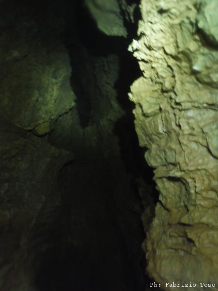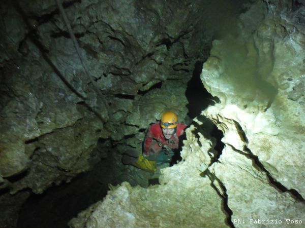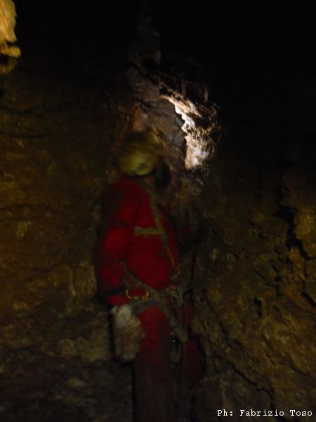 Scendo e subito mi tolgo l’attrezzatura per passare la strettoia. Una volta dall’altra parte importuno Giuseppe costringendolo a fermarsi per illuminare il tratto prima della strettoia,