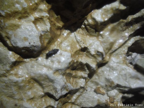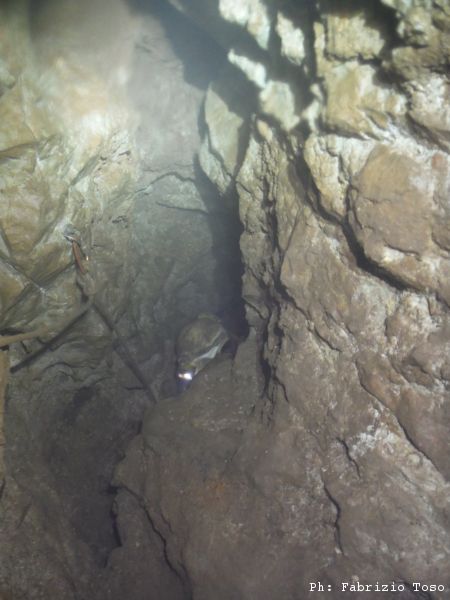 Quando siamo tutti assieme, iniziamo a lavorare di buona lena, sono le 2 del pomeriggio passate ed abbiamo 3 ore scarse di lavoro se non vogliamo uscire tardissimo come la volta scorsa. Gabriele e Giuseppe si dedicano alla curva piu’ avanti, io mi armo di mazzetta, ne abbiamo 2 oggi, e mi accanisco sulla strettoia che abbiamo appena passato. Alla fine Giuseppe riesce a passare oltre la curva ma dopo un paio di metri si deve fermare di nuovo. Dal lato mio ottengo il discreto risultato di rendere la strettoia molto piu’ comoda. Sono quasi le 6 del pomeriggio, e’ ora di prendere la strada del ritorno. Mentre Gabriele e Giuseppe si rifocillano, io mi rivesto della attrezzatura e parto per salire il primo pozzo. Alla base del 25 mi fermo ad aspettare. C’e’ Gabriele che sale dopo di me. Mentre aspetto di vedere la sua luce giro attorno cercando qualcosa di interessante da fotografare. Trovo un simpatico animaletto, ne ho visti parecchi di simili in mezzo al fango dell’ingresso, probabilmente il tapino e’ rimasto attaccato a qualcuno di noi ed ora si trova sperduto qua a 50 metri sotto terra.