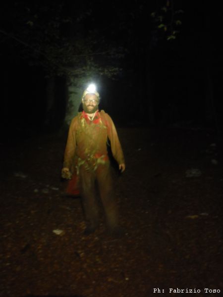 Si progredisce in maniera veloce per tenersi caldi e ci ritroviamo nello scivolo vicino all’imbocco dove sentiamo al di fuori voci amiche che ci incitano. Uscendo ci portiamo dietro un bel po’ di fango dello scivolo. Saranno contenti i prossimi che scenderanno. Una volta fuori veniamo a sapere che di pioggia ne ha fatta tanta, ma proprio tanta. Forse è una grotta da affrontare con condizioni meteo diverse.