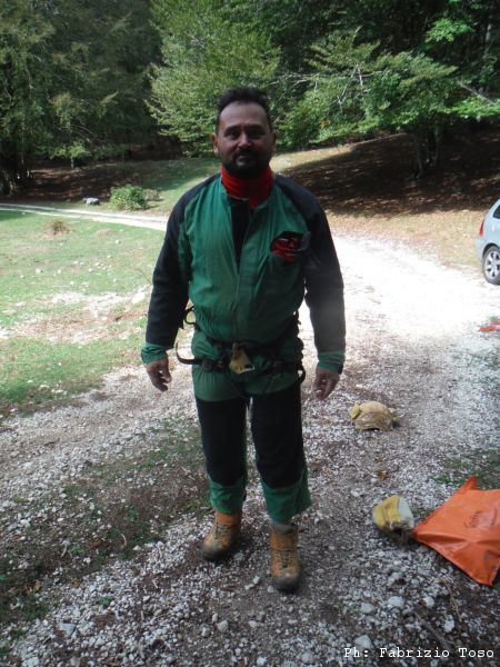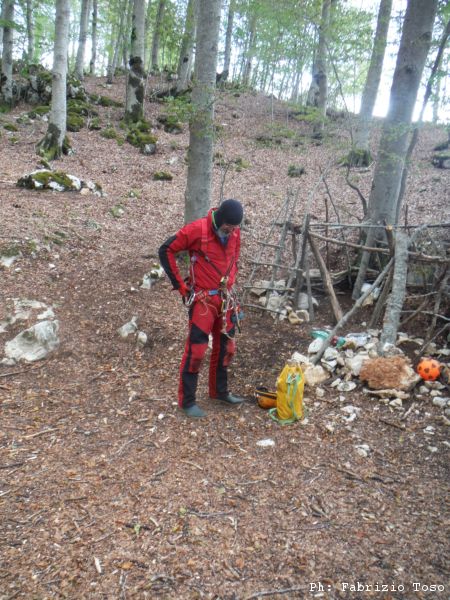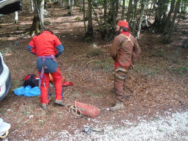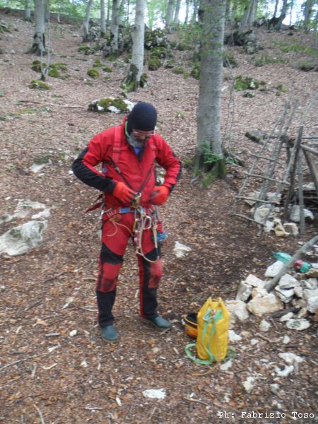 Gli ultimi controlli alla attrezzatura e siamo pronti ad entrare. In onore di Federica, Maurizio sistema la corda per armare anche il primo pozzetto. Di solito lo scendiamo in arrampicata, ma oggi potrebbe essere scivoloso. Oggi, visto che manca Giuseppe col suo fido orologio, mi sono ricordato di portare il mio cosi’ terro’ sott’occhio i tempi per non rischiare di uscire tardissimo. Inizio subito, entriamo poco prima dell’una.