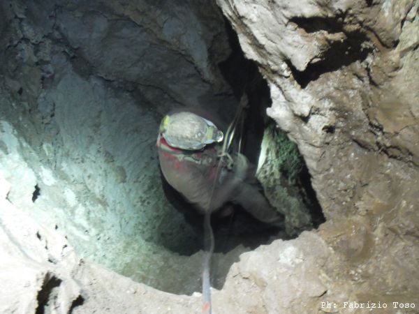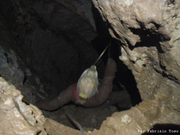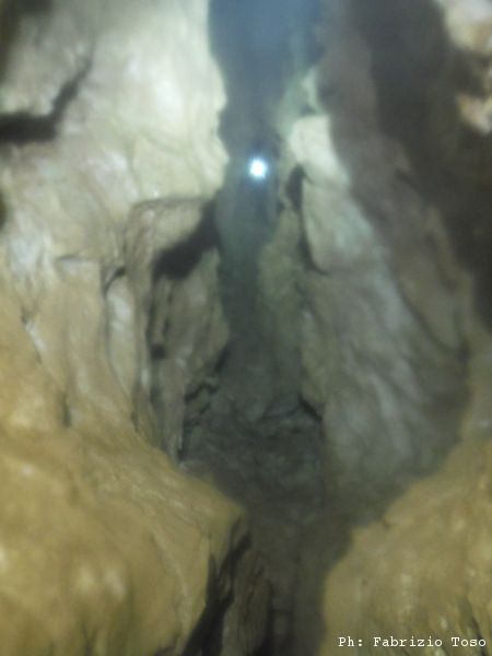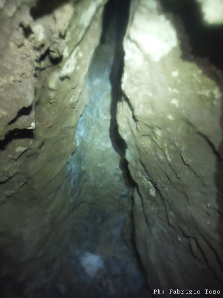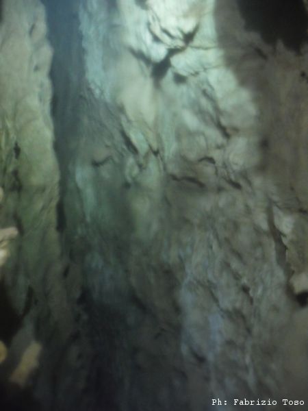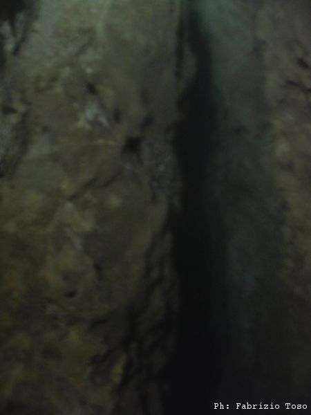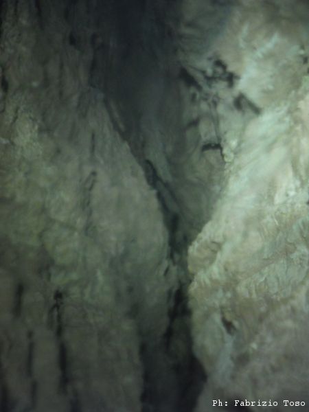 L’attesa non e’ breve per nulla, nel frattempo vengo raggiunto da Federica e quindi da Maurizio. Inizio a sentire un velo di freddo umido che mi avvolge quando sento finalmente l’atteso urlo di Gabriele che annuncia di aver terminato il suo lavoro. Nell’attesa mi sono preparato bardandomi di tutto il necessario (stavolta la punta del trapano e’ attaccata al trapano stesso mediante elastici!). In qualche secondo sono pronto a scendere. Passo il frazionamento di partenza e vado. Scendo lentamente per capire quale sia il punto migliore per deviare la corda. Veramente non ho ancora deciso se fare un altro frazionamento o un meno impegnativo deviatore. Nel dubbio mi sono fatto prestare un cordino da Maurizio. Arrivato ad un terzo circa della discesa vedo il punto in cui la corda tocca la roccia durante la salita. Scendo ancora piu’ lentamente. Alla mia destra mi sembra esserci della roccia buona, se riesco a spostarmi abbastanza magari si riesce anche a salire fuori dallo stillicidio. Decido di aver trovato il punto adatto. Puntando i piedi mi sposta lateralmente fino a trovare uno spuntone di roccia dove ancorarmi in maniera stabile. Decido per il deviatore. Prendo il trapano, pianto il fix e subito completo il tutto con la placchetta, il cordino di Maurizio ed uno dei moschettoni per l’armo. Contento del lavoro fatto mi appoggio leggermente ad una lama di roccia accanto a me. Nel sentirla muoversi avverto un brivido ghiacciato risalirmi su per la schiena. Urlo subito a Gabriele di mettersi al riparo meglio che puo’ ed attendo con apprensione che mi dia un segnale di via libera. Quando arriva mi sento gia’ meglio. Mi riavvicino alla lama di roccia per valutarne meglio la grandezza e la possibilita’ di spostarla di peso su una cengia. La muovo leggermente e quel che vedo mi lascia ancora piu’ preoccupato. La lama di roccia e’ lunga quanto la mia gamba, larga mediamente circa mezzo metro e spessa circa 3 dita, si regge in quella posizione per un miracolo di equilibrio. Nel descriverne le dimensioni ho fatto un poutpourri di unita’ di misura, ma penso rendano ugualmente l’idea di una cosa abbastanza pesante e preoccupante. Per prima cosa escludo di poterla portare di peso a mano. Penso che potrei imbragarla per poi calarla giu’ ma poi ricordo che sotto di me c’e’ il nodo di giunzione che non passera’ mai nel moschettone dell’ultimo rinvio. Alla fine mi rassegno, scosto il piu possibile la corda e spingo la lama di roccia in direzione opposta. Alla minima sollecitazione laterale che vi applico la lama cade. Spingendola lateralmente, come speravo, la roccia cade sulla cengia alcuni metri piu’ in basso esplodendo letteralmente in mille pezzi con un boato assordante. Mi conforta non aver sentito strattoni sulla corda, dovrebbe essersi salvata. Impiego i secondi seguenti a riprendermi dallo spavento ed a sincerare i miei amici, sia Gabriele di sotto che Federica e Maurizio di sopra, che ora e’ tutto a posto. Attacco la corda al nuovo deviatore e proseguo la discesa saggiando e scrutando con attenzione la corda per rilevare eventuali lesioni. Al punto del frazionamento la corda non passa dentro uno dei moschettoni a fare da deviatore, probabilmente Gabriele ha deciso che non serviva. Alla fine e’ stato un bene perche’ cosi’ ho potuto scostare di piu’ la corda. Relativamente con poco sforzo metto la longe per stare comodo e sistemo di nuovo il frazionamento. Continuo a scendere controllando con attenzione la corda. Fino al deviatore trovo tutto a posto. Passo anche lui e continuo la mia lenta discesa. Con la corda rossa riesco ad arrivare quasi a terra, devo solo arrampicarmi su uno spuntone di roccia quel che basta a togliere il discensore. Avevo pensato di dover fare un frazionamento a 2 metri da terra per isolare la giunzione. Meglio di quanto mi aspettassi. Al nodo di giunzione trovo la sorpresa, il capo libero della seconda corda, lungo circa 40 cm e’ quasi tranciato a meta’ lunghezza, un taglio netto, quasi fosse stato fatto con un coltello affilatissimo. Un piccolo brivido ne accompagna la visita, poi riprendo a sistemare rimettendo in posa il traverso di prudenza e quindi la calata fino al meandro dove stiamo lavorando. Terminate le sistemazioni mi preparo a scendere l’ultimo breve tratto e prima di partire urlo la libera ai miei infreddoliti amici, che aspettano sopra. Mentre loro scendono, Gabriele ed io andiamo in zona lavori ed iniziamo ad attrezzarci. Quando siamo tutti, il lavoro prende il pieno ritmo. Visto che sono le 2 e un quarto del pomeriggio, Federica approfitta per mangiare il suo panino. Alla curva a gomito della volta scorsa si potrebbe gia’ passare ma continuiamo ad allargare poiche’ dopo un paio di metri si deve allargare ancora ed e’ opportuno che il passaggio precedente sia comodo per tutti. Pensavo peggio, il passaggio successivo lo rendiamo transitabile in un paio d’ore. Riesco a passare la prima volta con qualche sbuffo e sospiro ma poi torno subito indietro per continuare a lavorarci e rendere il passaggio piu’ agevole. Alle 4 e mezzo il buon Maurizio cede le armi e decreta che per lui e’ arrivata l’ora di risalire, deve quasi aver finito i sigari! Federica lo segue, sono circa le 5 meno un quarto. Gabriele ed io continuiamo a lavorare per non freddarci troppo. Ora il passaggio non e’ troppo scomodo, torno nel nuovo piccolo ambiente che al momento termina questo ramo della grotta e cerco di convincere la fotocamera a fare il suo mestiere per potervi mostrare qualcosa. Il punto piu’ promettente sembra essere verso l’alto dove sembra allargare.