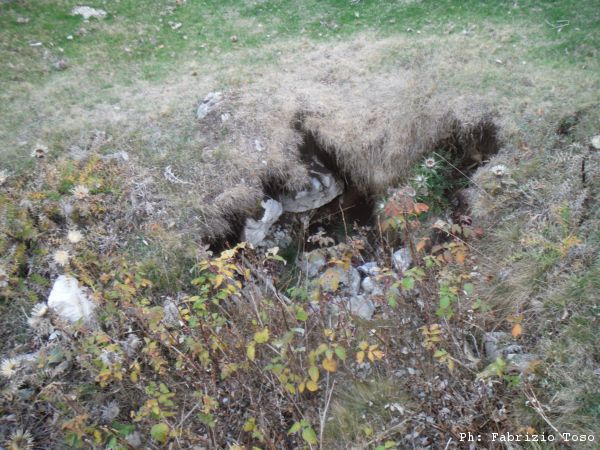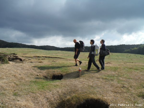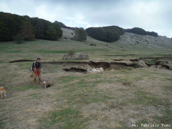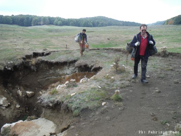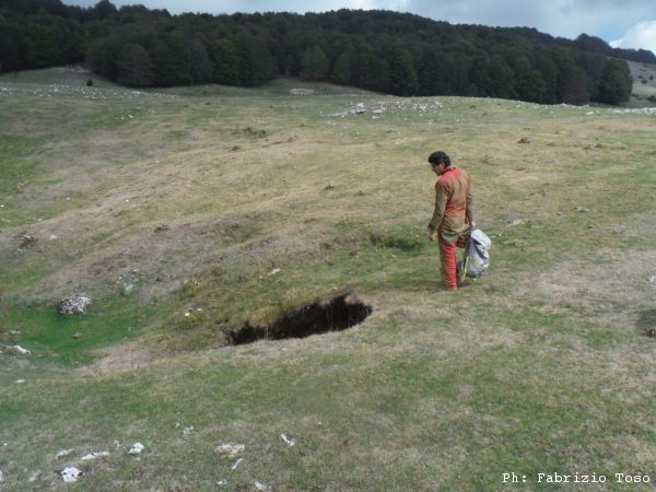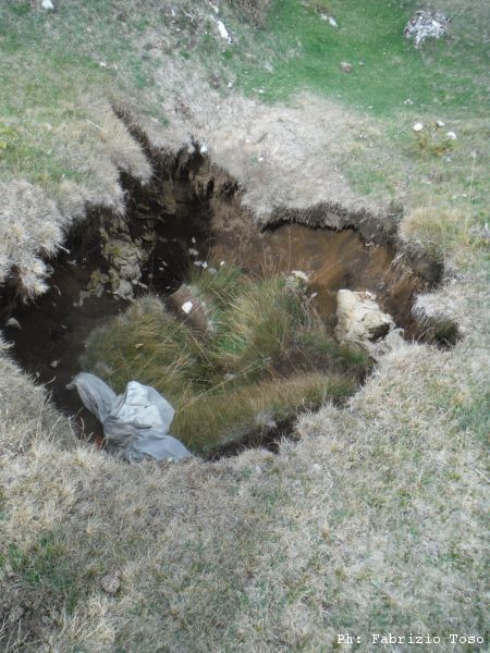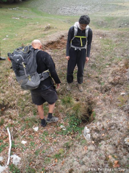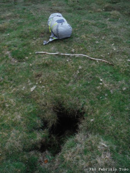 Ripresi gli zaini ci muoviamo di circa 50 metri all’interno della piana. Qua c’e’ un altro buco.