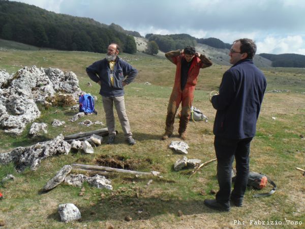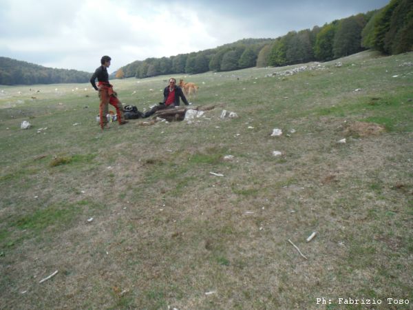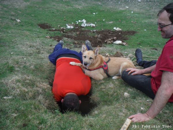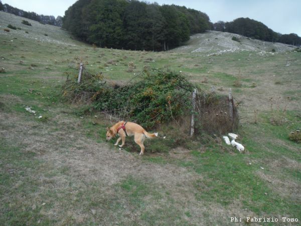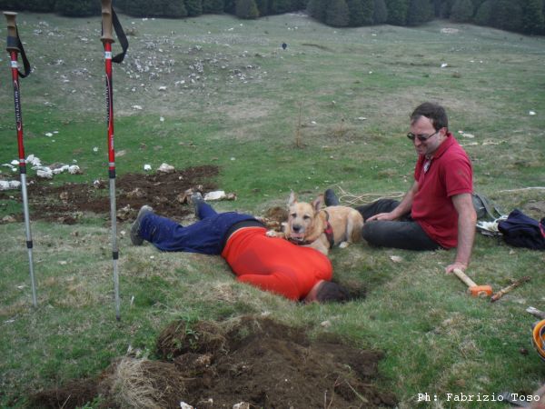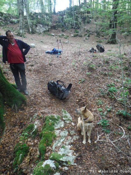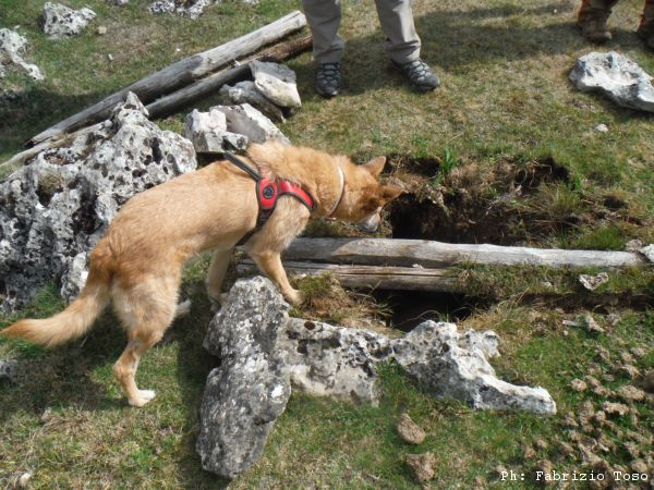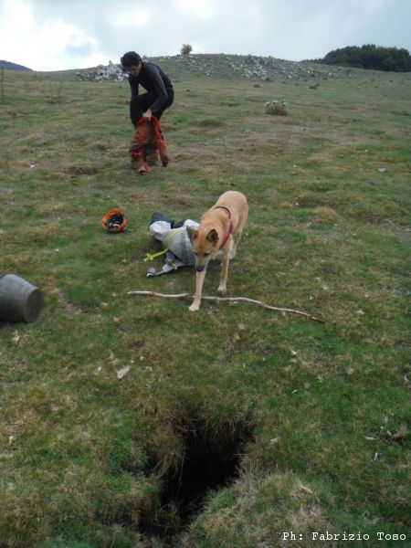Giuseppe e’ il piu’ solerte del nostro piccolo gruppo e subito si prepara indossando la tuta per iniziare a spostare terra e sassi. Anche Luna interrompe le sue corse sfrenate per guardare bene il buco che ha attirato la nostra attenzione. Nel frattempo io inizio a togliere qualche sasso mentre Gabriele continua a perlustrare la piana cercando inoltre le “filagne” con cui tapperemo il buco una volta terminati i lavori.